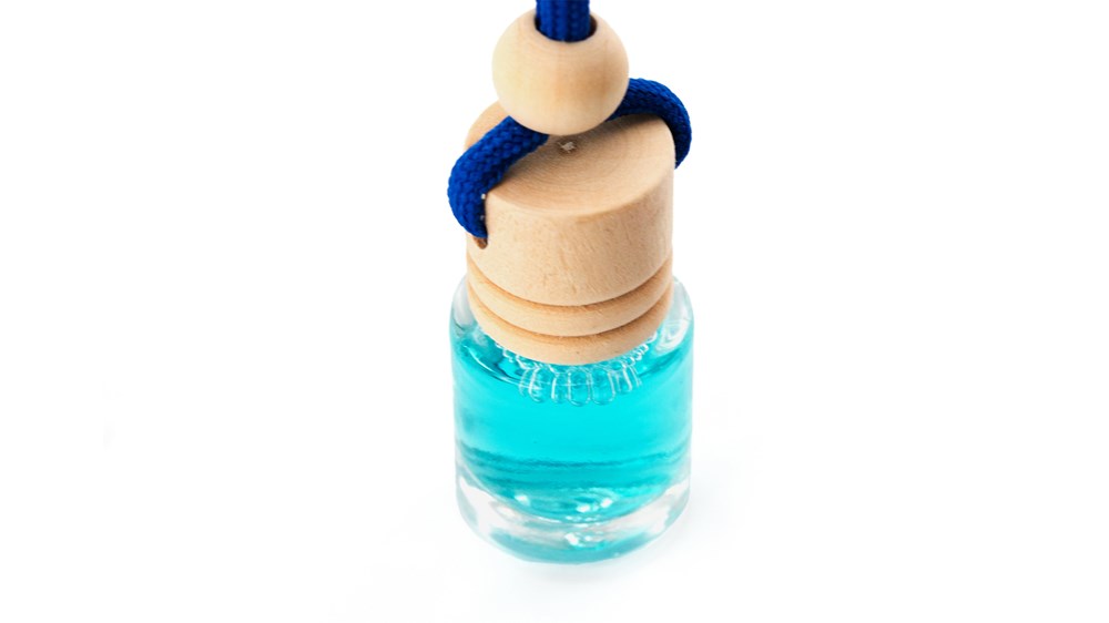 Auto-Lufterfrischer mit Oceanduft in 5 ml Glas mit Holzdeckel und farblich passender Kordel zum Aufhängen mit Kordelstopper aus Holz. Präsentiert in einer individuellen PVC-Box.