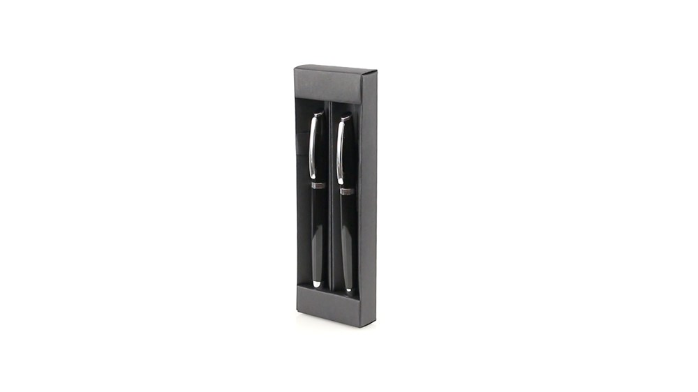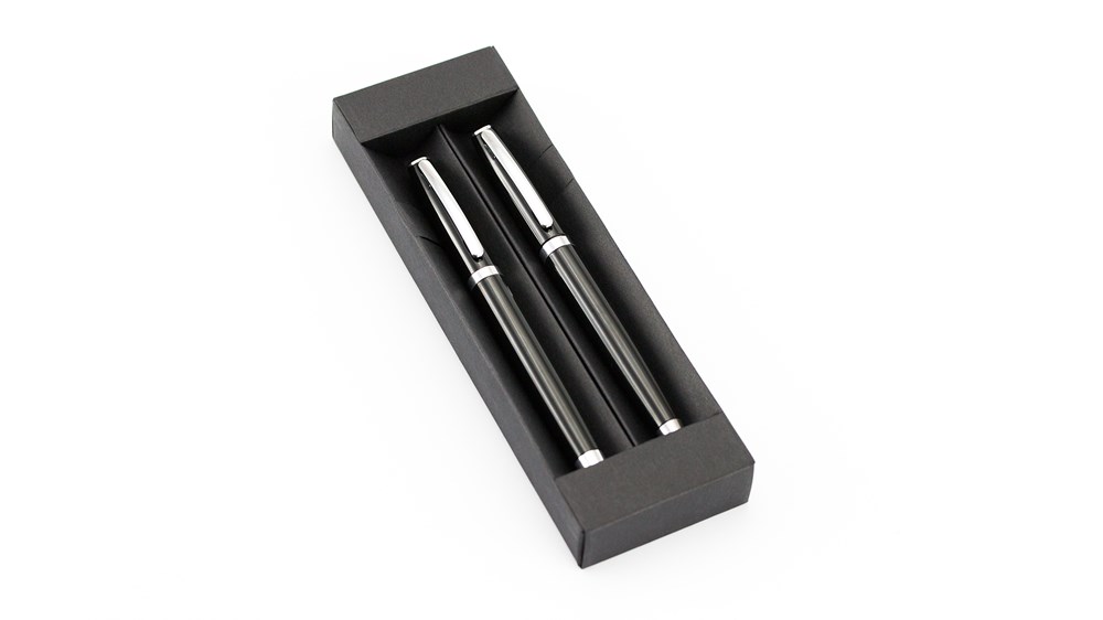 Elegantes Set aus Dreh-Kugelschreiber und Tintenroller mit schlichtem Design. Mit geschmeidigem Aluminiumschaft mit Details in Silber. Präsentiert in einem schwarzen Karton-Etui. Kugelschreiber mit Jumbo-Patrone mit blauer Tinte.