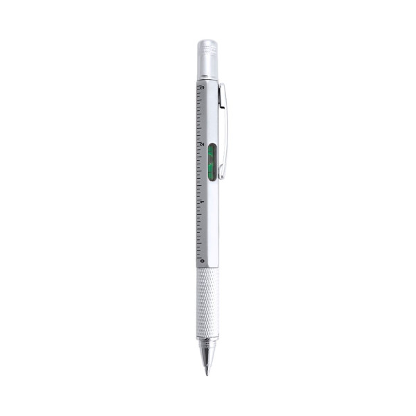 4-in-1 Multifunktions-Dreh-Kugelschreiber in verschiedenen Farben. Mit weichem Griff und integrierter Wasserwaage sowie Lineal mit Skala in Zentimetern und Zoll und Doppelkopf-Schraubendreher - schlitz- und kreuzförmig. Mit Metallclip und blauer Tinte.