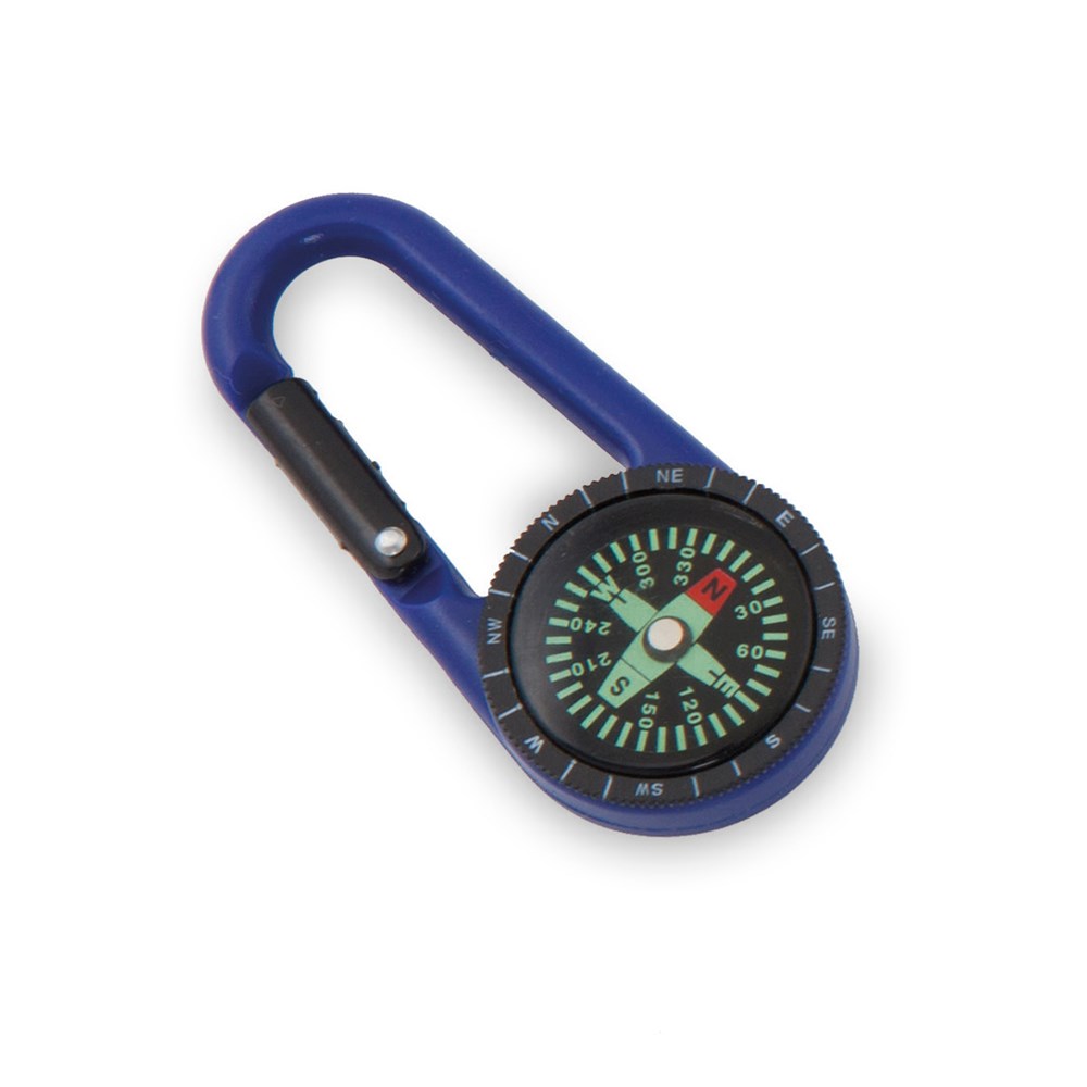 Kompass mit Karabiner in kräftigen Farben und robuster Ausführung.