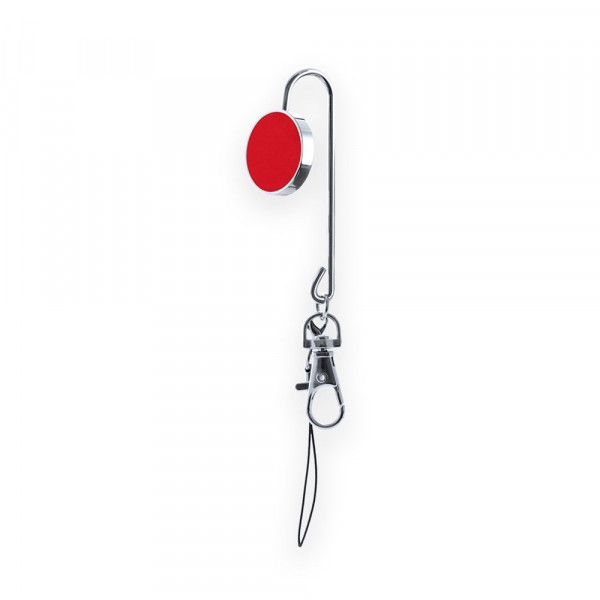 Schlüsselanhänger mit Handtaschenhalter aus Metall. Haken mit Kunstlederbesatz in kräftigen Farben sowie Trageschlaufe mit Karabinerverschluss. Präsentiert in einer individuellen Hülle.
