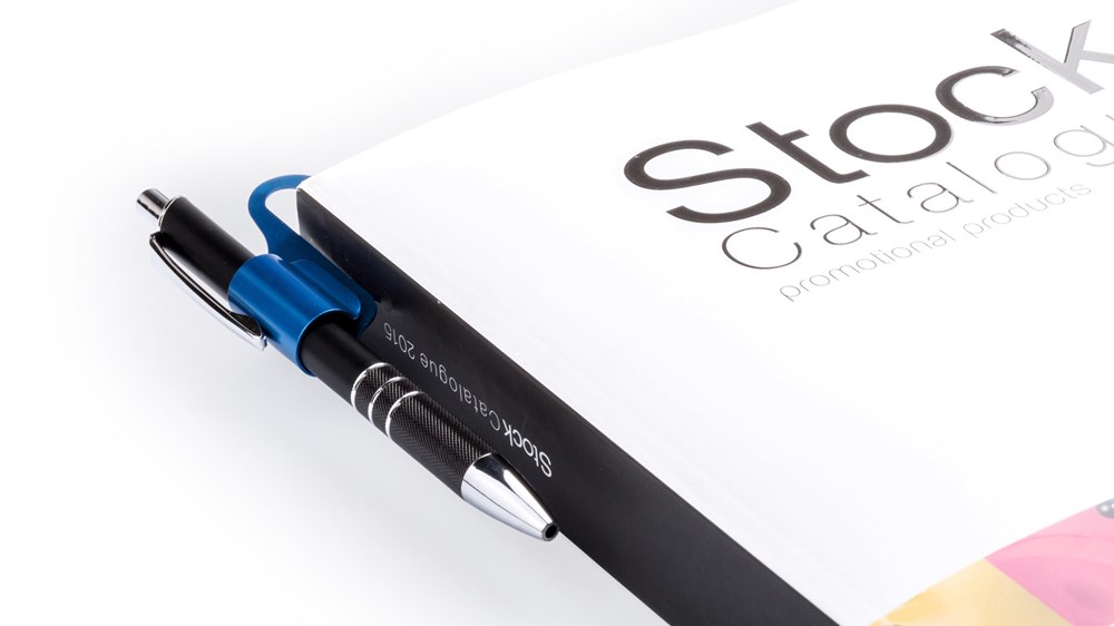 Originelles Lesezeichen aus glänzendem Aluminium in verschiedenen Farben - mit integriertem Stifthalter. Präsentiert in einer PVC-Hülle.