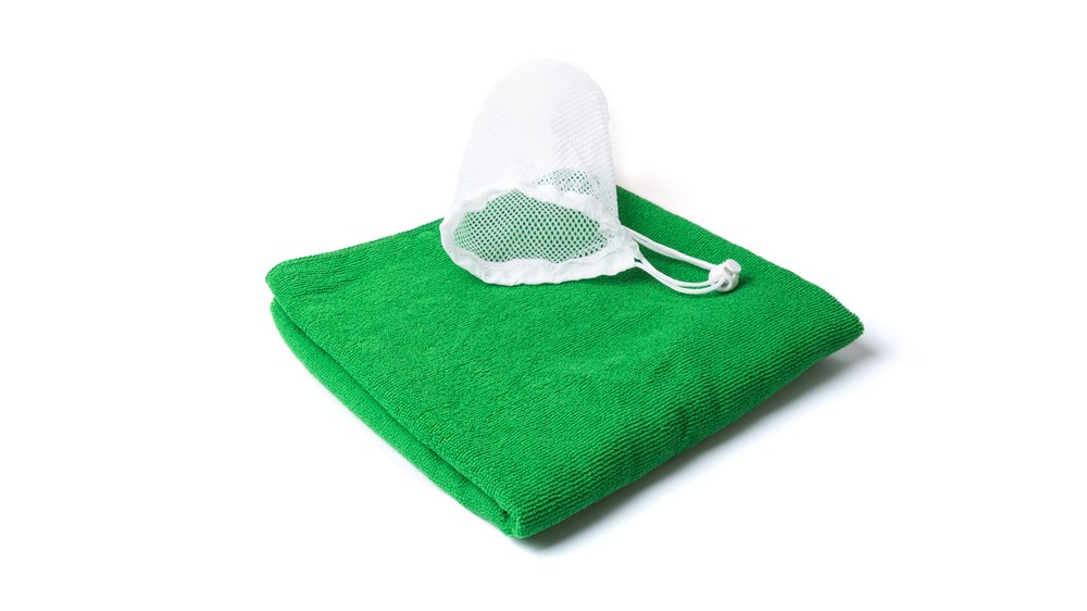 Handtuch mit den Maßen 100 x 50 cm aus saugfähiger, weicher Mikrofaser (185 g/m2) in verschiedenen Farben. Präsentiert in einer praktischen Netztasche mit Kordelzug und Stopper.