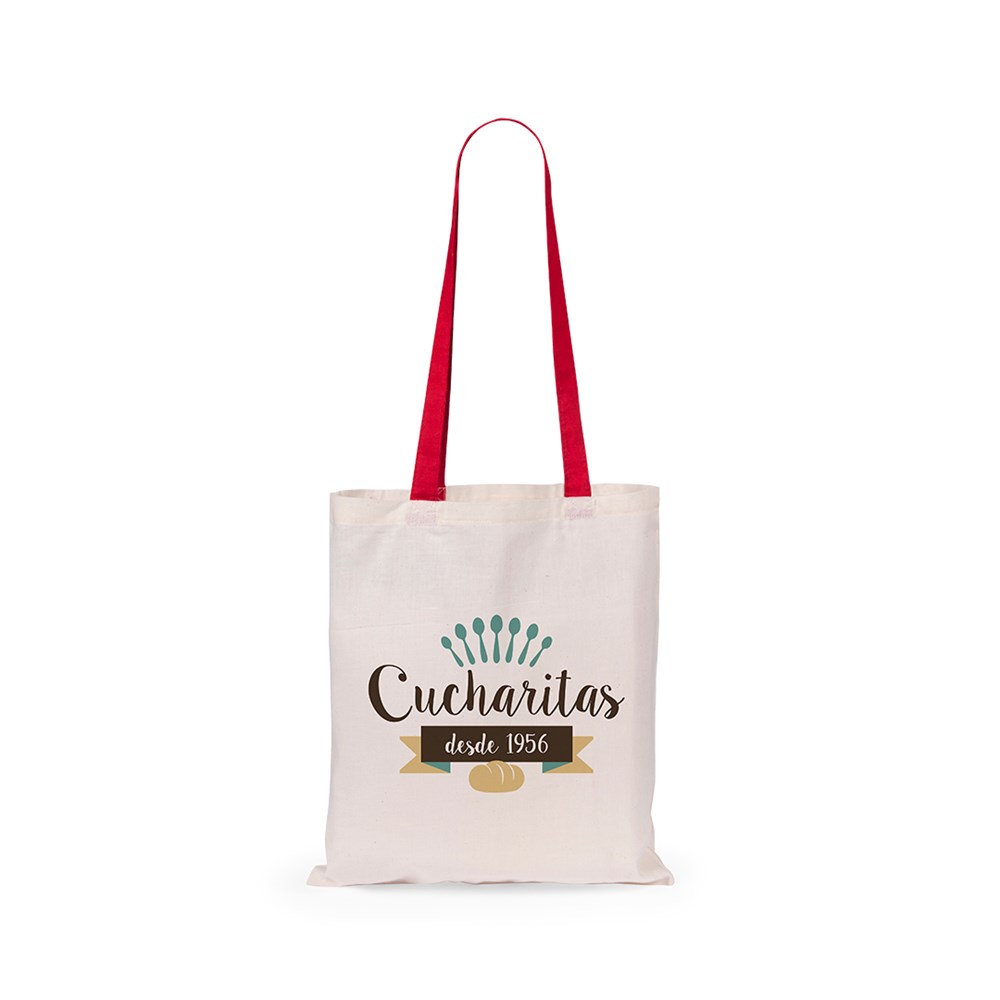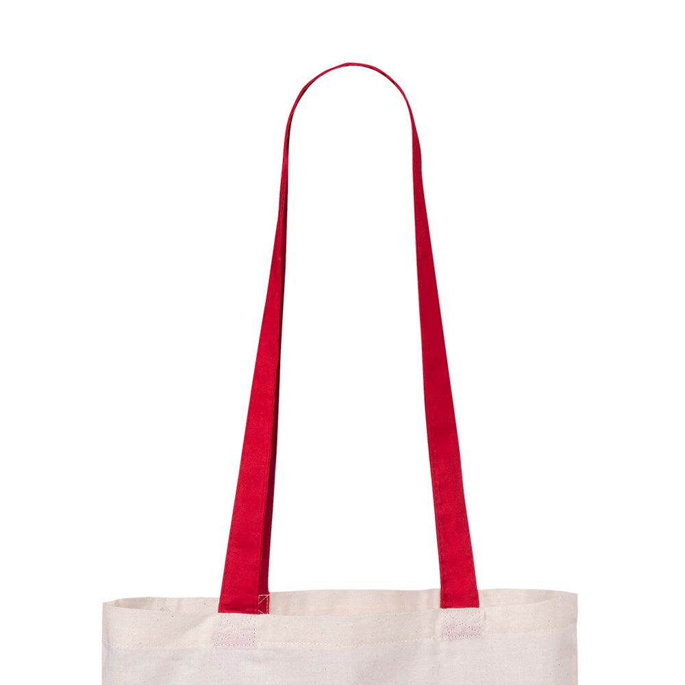 Tasche aus 100 % Baumwolle in Naturfarbe. Mit 70 cm langen Henkeln in verschiedenen kräftigen Farben und Steppnähten. Belastbar mit bis zu 7 kg.