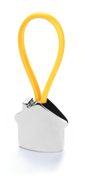 Metall-Schlüsselanhänger mit elegantem Haus-Design in 3D. Mit Gummiband in verschiedenen lebendigen Farben für die Befestigung der Schlüssel.