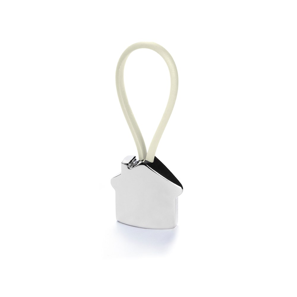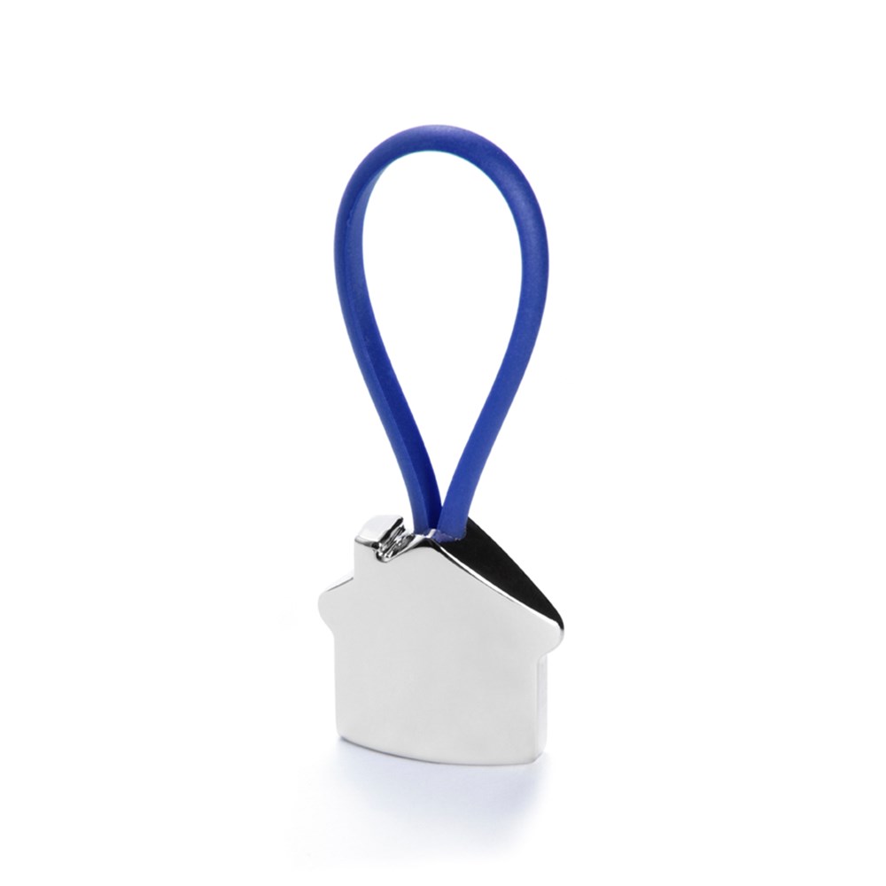 Metall-Schlüsselanhänger mit elegantem Haus-Design in 3D. Mit Gummiband in verschiedenen lebendigen Farben für die Befestigung der Schlüssel.