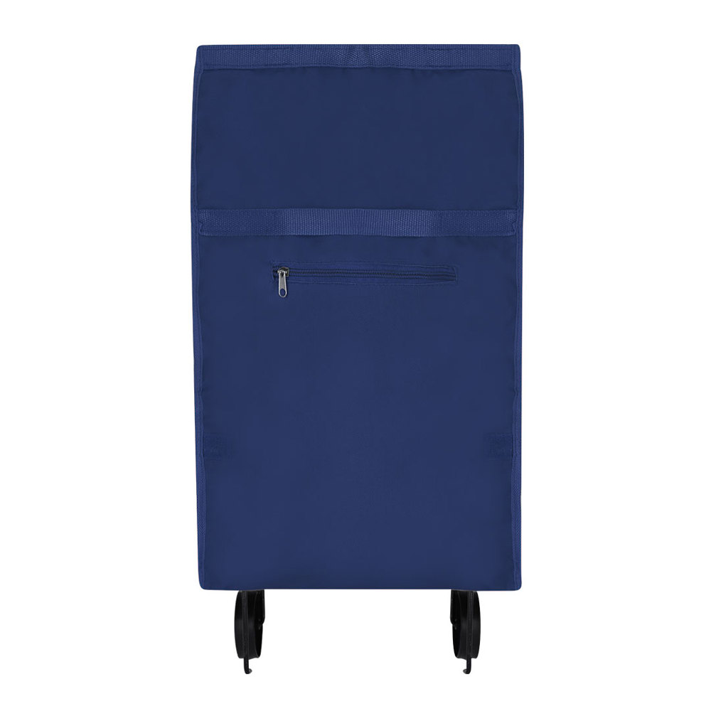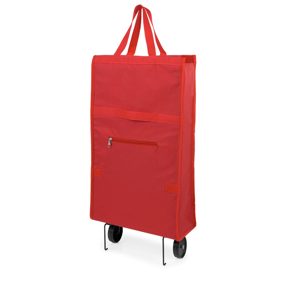 Faltbarer Einkaufstrolley aus robustem 600D Polyester in kräftigen Farben. Mit farblich passenden, verstärkten Nylongriffen, Fronttasche mit farblich passendem Reißverschluss sowie Standbeinen aus Metall. Zusammenfaltbar auf kleine Größe.
