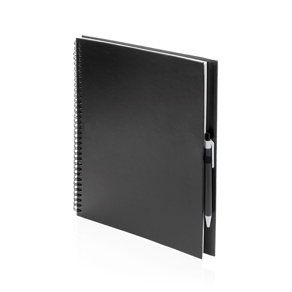 Ring-Notizbuch mit Soft-Touch-Cover aus resistentem Recyclingkarton und Kugelschreiber aus dem gleichen Material in passender Farbe. Mit 80 Blättern sowie Stifthalter auf der Rückseite. Verfügbar in verschiedenen auffälligen Farben.
