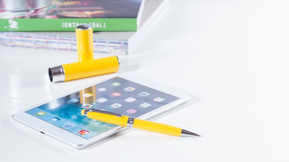 Dreh-Kugelschreiber mit integriertem Stylus und Metallgehäuse in kräftigen Farben mit Kontrastdetails und Ringen in Silber. Mit farblich passendem Stylus, sowie Jumbo-Patrone mit blauer Tinte. Präsentiert in einem originellen Metall-Etui in passender Farbe.