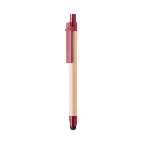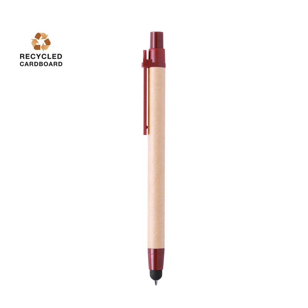 Druck-Kugelschreiber mit origineller Kombination - Schaft aus Recyclingkarton in Naturfarbe und Kontrastdetails in lebendigen Farben. Mit schwarzem Stylus und blauer Tinte.