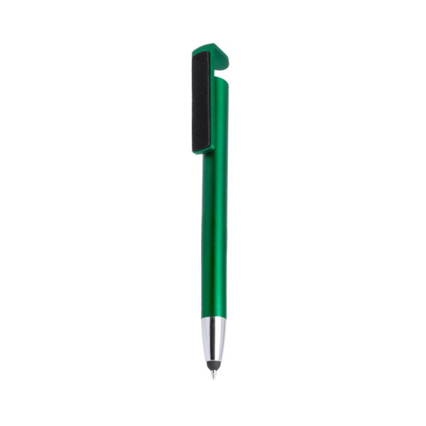 Multifunktioneller Druck-Kugelschreiber in kräftigen Farben mit speziellem Clip mit doppelter Funktion: Ständer für Mobilgeräte und Bildschirmreiniger. Mit Metallschaft - speziell entwickelt für den Tampondruck. Schwarze Tinte.