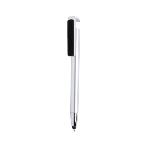 Multifunktioneller Druck-Kugelschreiber in kräftigen Farben mit speziellem Clip mit doppelter Funktion: Ständer für Mobilgeräte und Bildschirmreiniger. Mit Metallschaft - speziell entwickelt für den Tampondruck. Schwarze Tinte.