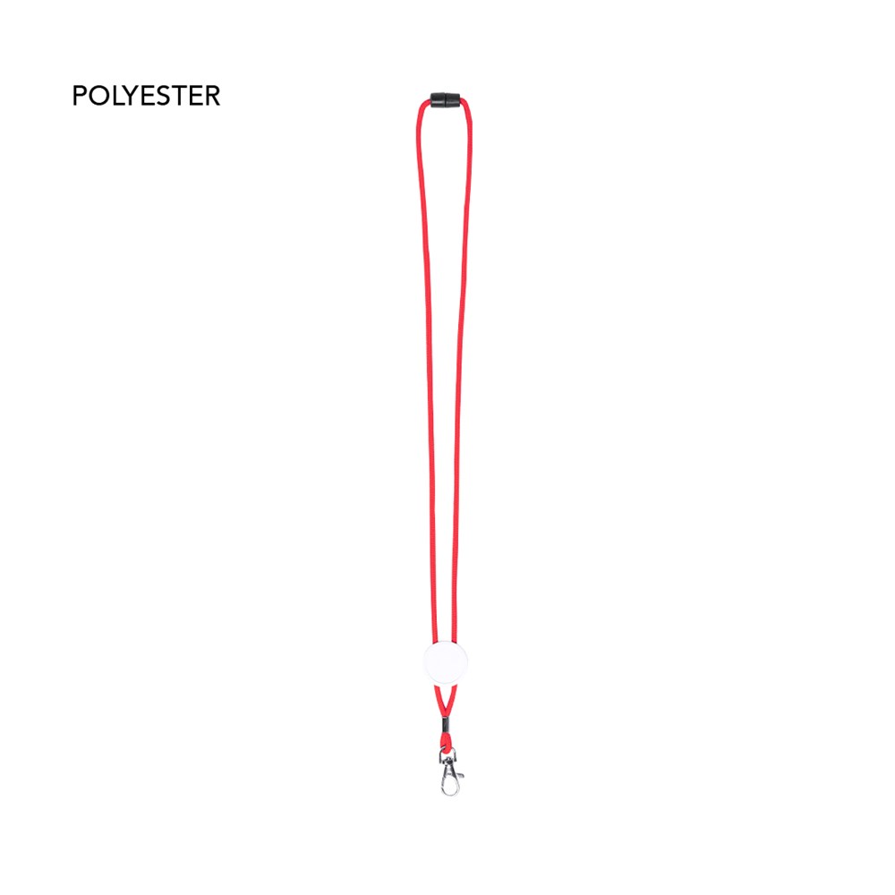 Lanyard mit robuster Kordel aus weichem Polyester in verschiedenen lebendigen Farben. Mit Klickverschluss am Nacken, Befestigungskarabiner aus Metall und zentraler Fläche zum Bedrucken.