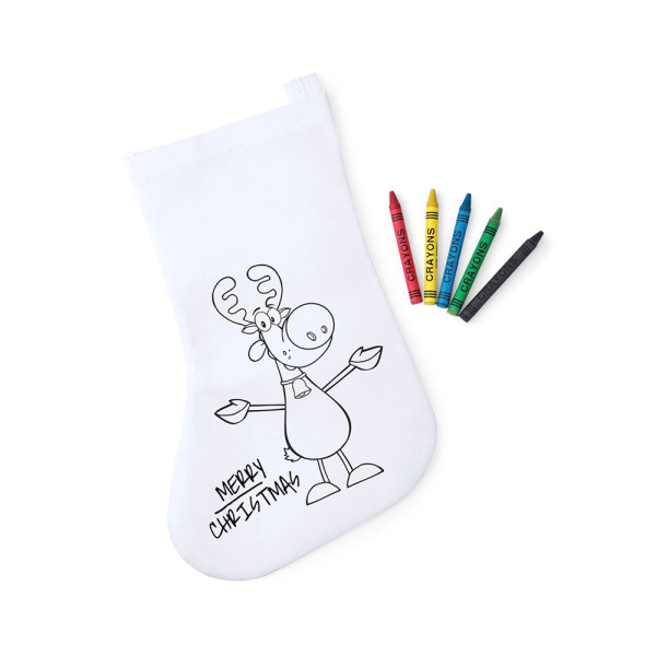 Non-Woven-Weihnachtssocke aus Faservlies in Weiß. Speziell entwickelt für das Bemalen mit Wachsmalstiften. Enthält 5 zylinderförmige Wachsmalstifte in verschiedenen Farben. Mit Schlaufe zum Aufhängen und hitzeversiegelter Oberfläche.