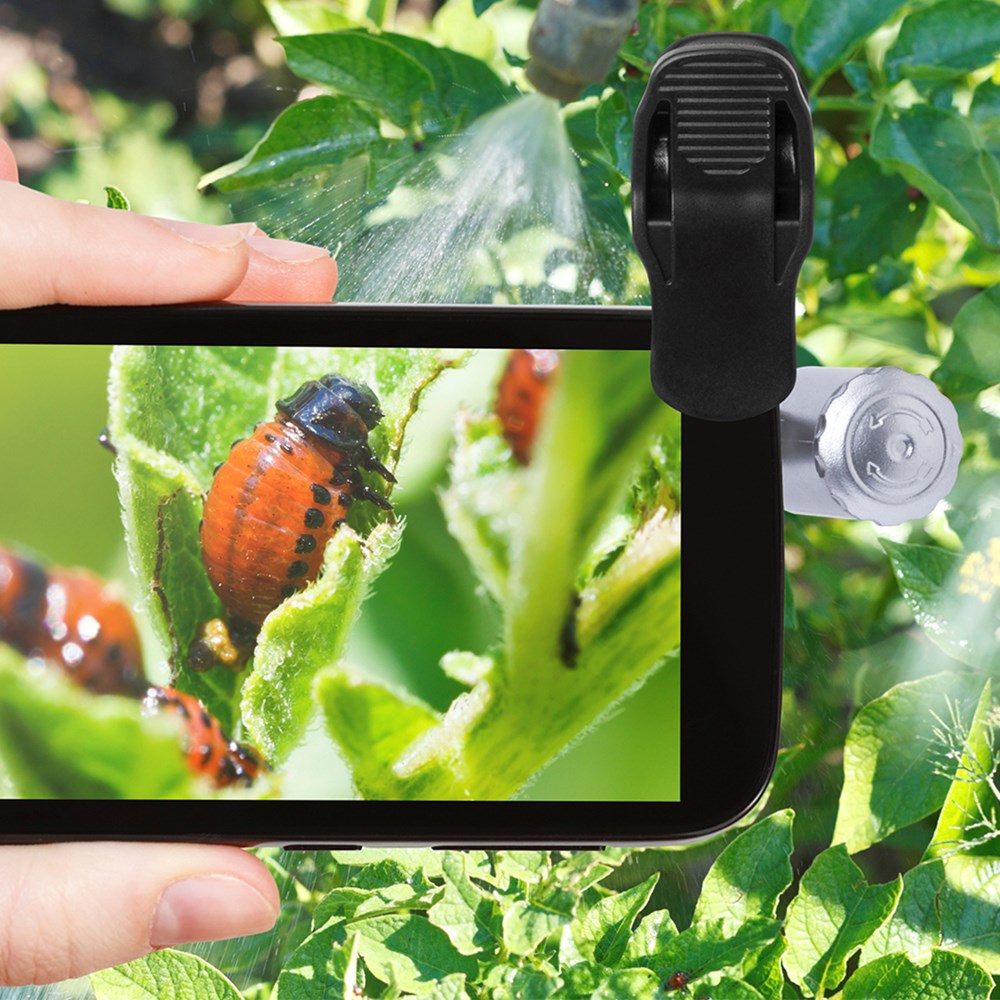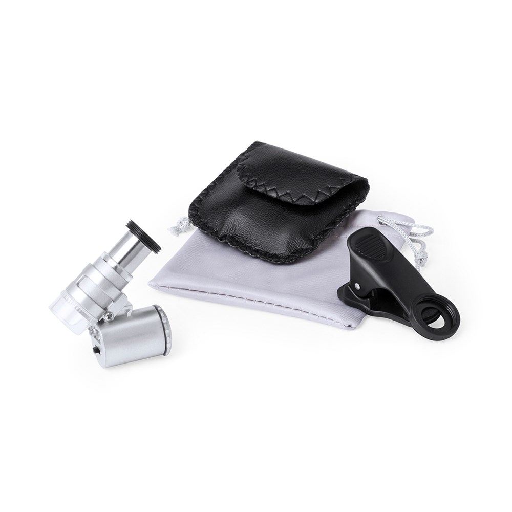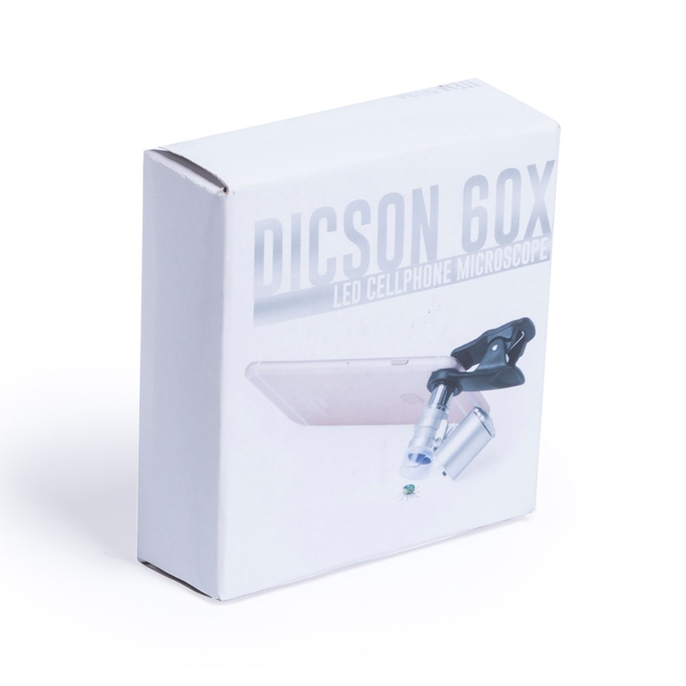 Mikroskop für Smartphones mit Befestigung an der Kamera durch Clip. Mit Kristallvergrößerungslinse mit bis zu 60-facher Vergrößerung, 2 LEDs und ultraviolettem Licht für ein außergewöhnliches Bild. Knopfzellen inklusive. Verpackt in einem eleganten Kunstleder-Etui und Stoffbeutel und präsentiert in einer attraktiven Designbox.