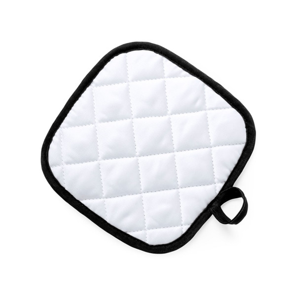 Weicher Topflappen aus 100 % Polyester in Weiß, mit Rändern in kräftigen Farben. Mit Schlaufe zum Aufhängen und einer glatten Seite - speziell für den Sublimationsdruck entwickelt.
