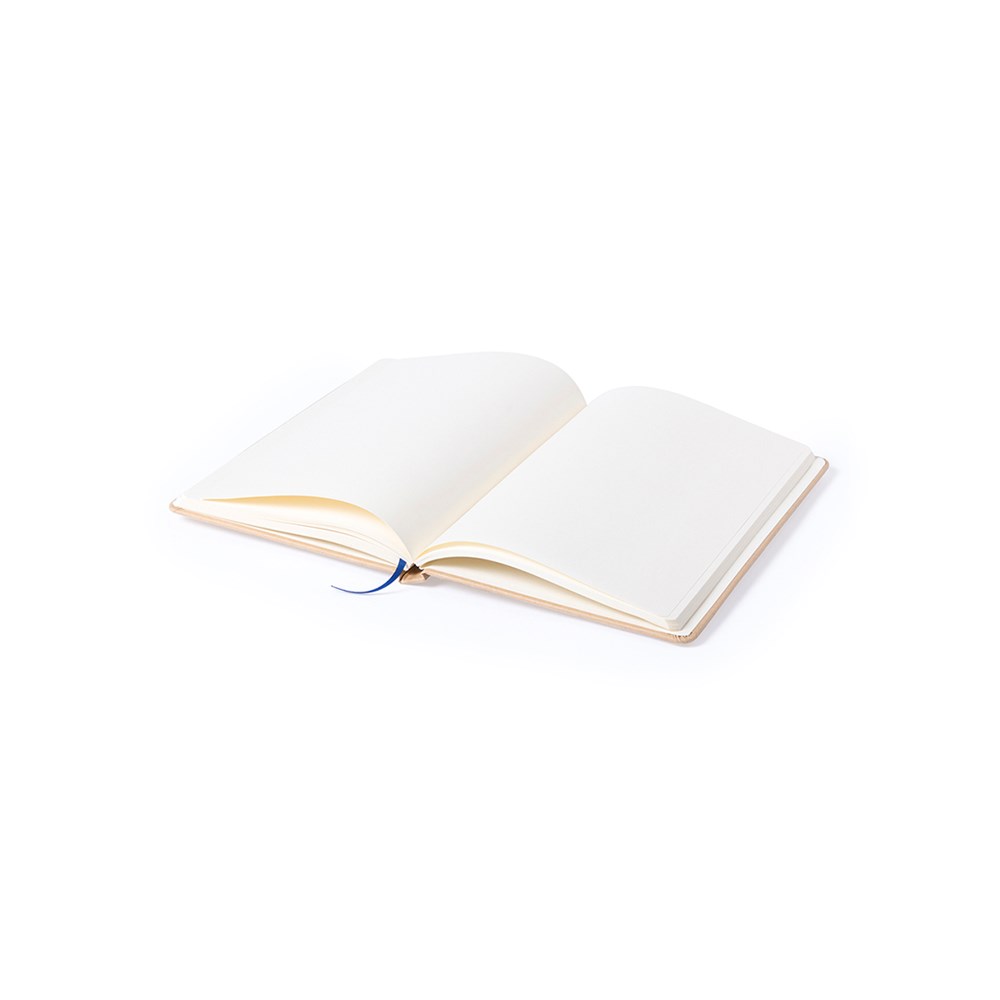 Notizblock mit Soft-Touch-Cover aus robustem Karton in Naturfarbe. Mit 100 Blättern, Gummibandverschluss und farblich passendem Lesezeichenband.