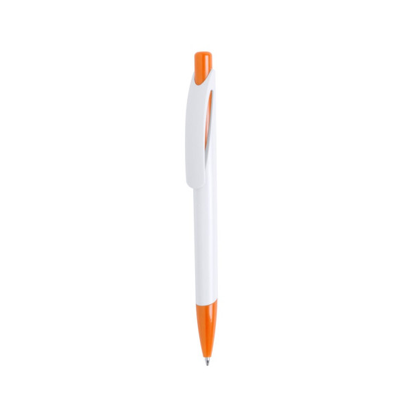 Druck-Kugelschreiber mit auffälligem, zweifarbigem Design mit Kontrastdetails in glänzenden, soliden Farben und geschmeidigem Schaft in solidem Weiß. Mit originellem, gebogenem Clip und farblich passender Spitze. Blaue Tinte.