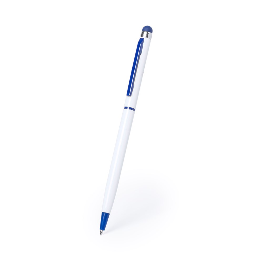 Dreh-Kugelschreiber mit weißem Aluminiumgehäuse und Kontrastdetails in verschiedenen glänzenden Farben. Mit gestanztem Clip und blauer Tinte.