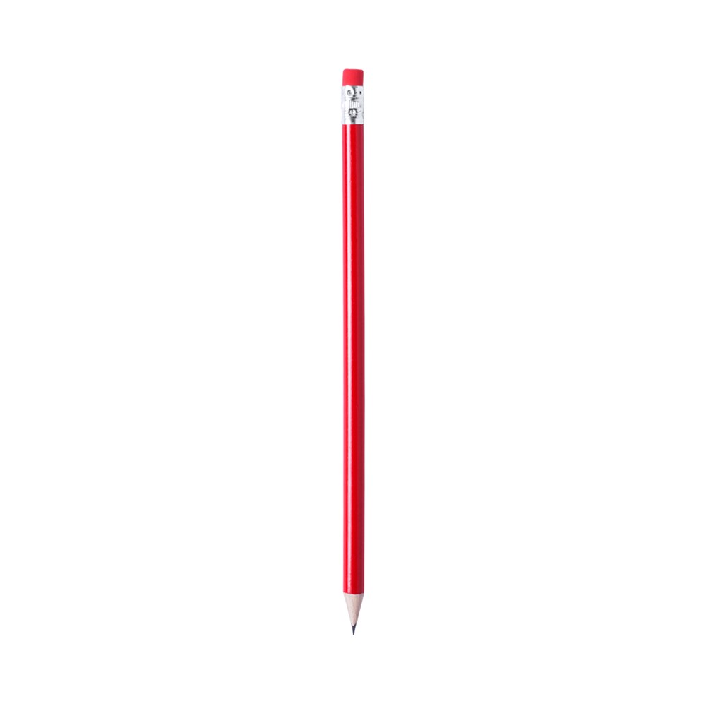 Holzstift mit glänzender Oberfläche. Mit rundem Griff und passendem Radiergummi. Erhältlich in einer Vielzahl von Farben. Schwarze Mine und scharfe Spitze.