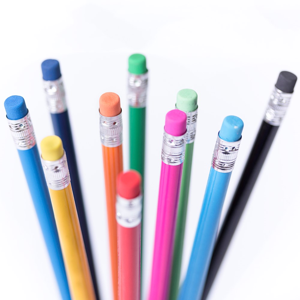 Holzstift mit glänzender Oberfläche. Mit rundem Griff und passendem Radiergummi. Erhältlich in einer Vielzahl von Farben. Schwarze Mine und scharfe Spitze.