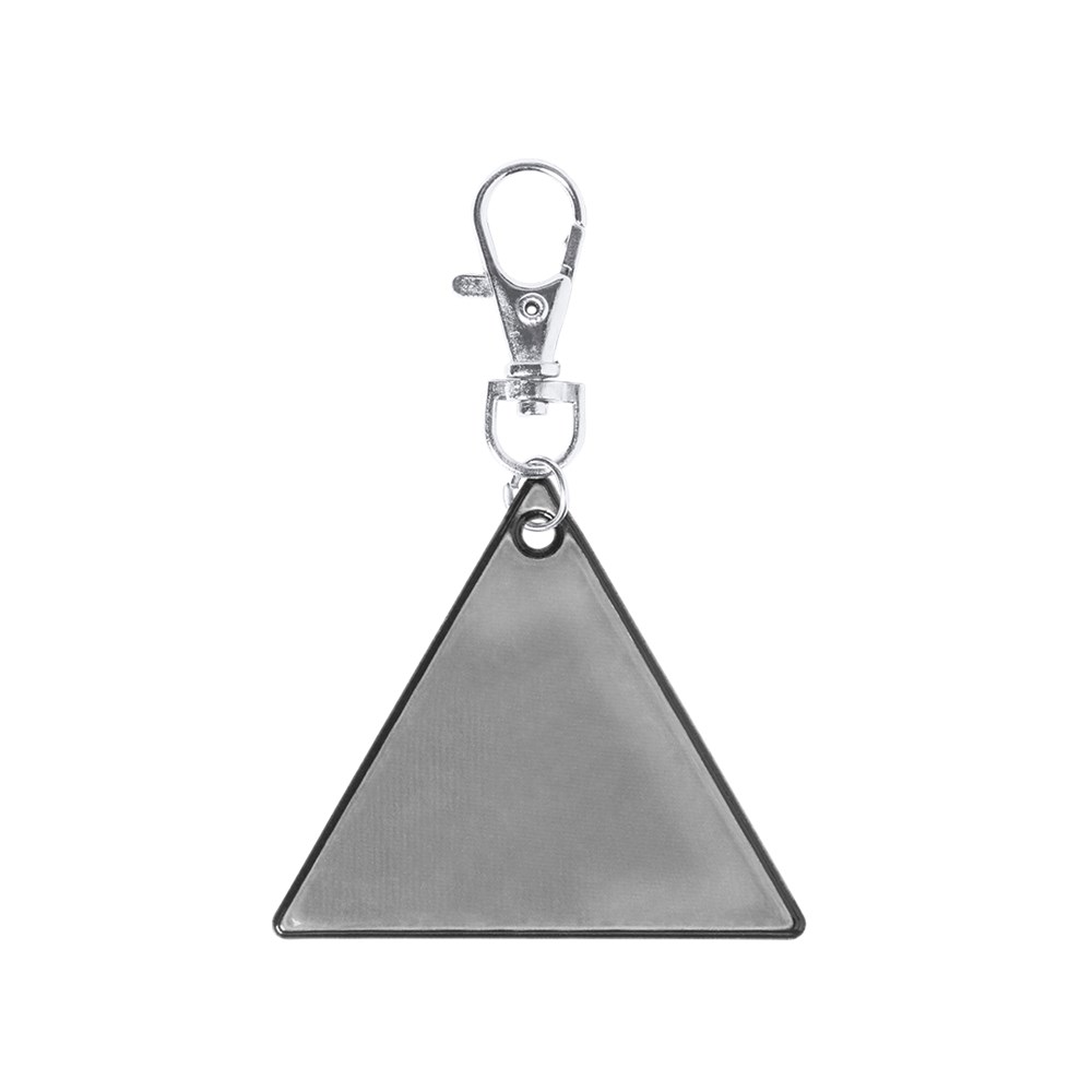 Schlüsselanhänger mit dreieckigem Design aus reflektierendem PVC mit hoher Sichtbarkeit und Karabiner zur Befestigung.