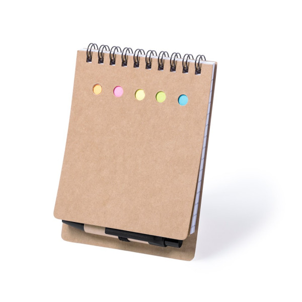 Spiral-Haftnotizblock mit Kugelschreiber aus Recyclingkarton. Mit Soft-Touch-Cover aus solidem recyceltem Karton mit Stanzung. Enthält Notizblock mit 50 linierten Blättern, 15 große und 75 Mini-Haftnotizen. Kugelschreiber mit blauer Tinte.
