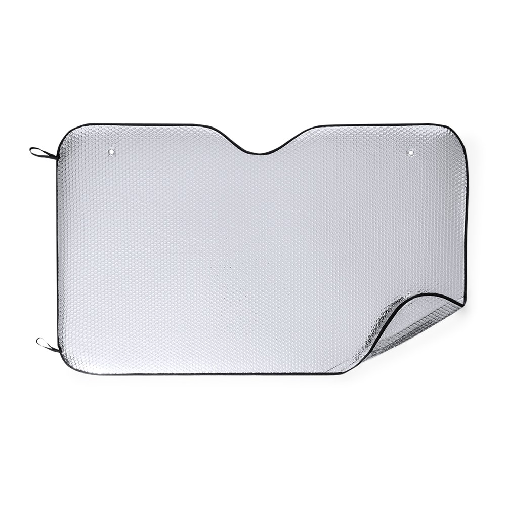 Sonnenschutz aus Aluminum in Silber-Metallic mit schwarzer Paspel. Mit den Maßen 130 x 80 cm, Gummibändern zum Fixieren im gefalteten Zustand, Metallösen zur Verstärkung, sowie zwei Saugnäpfen für die Befestigung an der Windschutzscheibe. Präsentiert in ungefaltetem Zustand für einfaches Bedrucken.