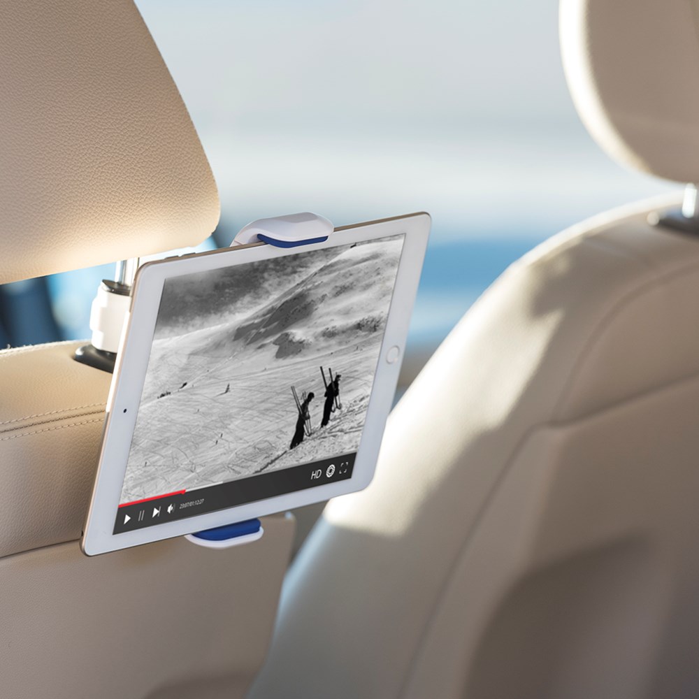 Originelle Halterung für Mobilgeräte von bis zu 10 Zoll zum Befestigen an der Kopfstütze des Autos. In verschiedenen Farben, 360º drehbar und mit rutschfesten Gummieinsätzen für einen sicheren Halt.