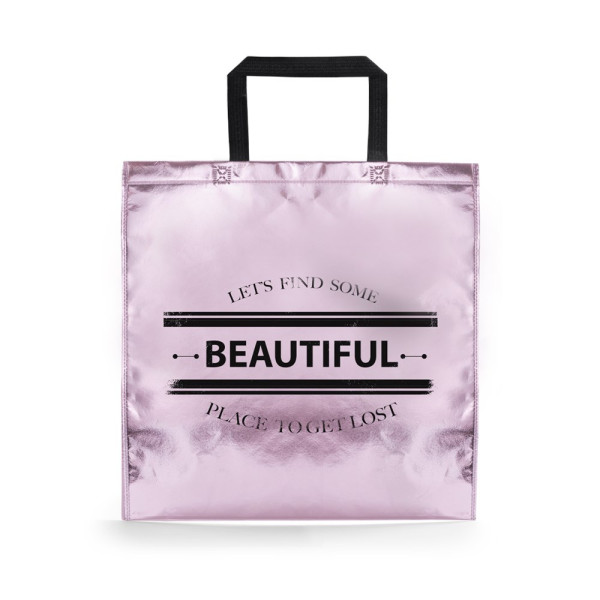 Non-Woven-Tasche aus Faservlies in laminierter, hitzeversiegelter Metallausführung. Erhältlich in Gold, Silber und Roségold. Mit verstärkten, 42 cm langen Henkeln. Mit verstärktem Zwickel und Paspel. Belastbar mit bis zu 7 kg.