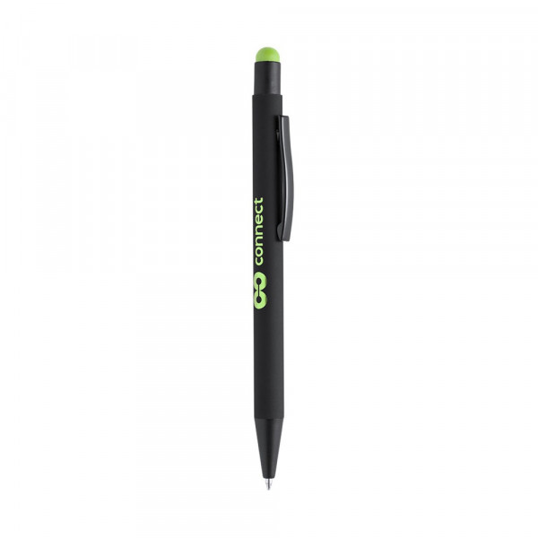 Dreh-Kugelschreiber in Schwarz mit Stylus und Druckknopf in verschiedenen Farben. Mit Metall-Clip in Schwarz. Speziell für den Laserdruck entworfen und mit einer speziellen Außenbeschichtung versehen, durch die Ihr Logo perfekt graviert wird - passend zur Farbe des Druckknopfes. Jumbo-Patrone mit blauer Tinte.
