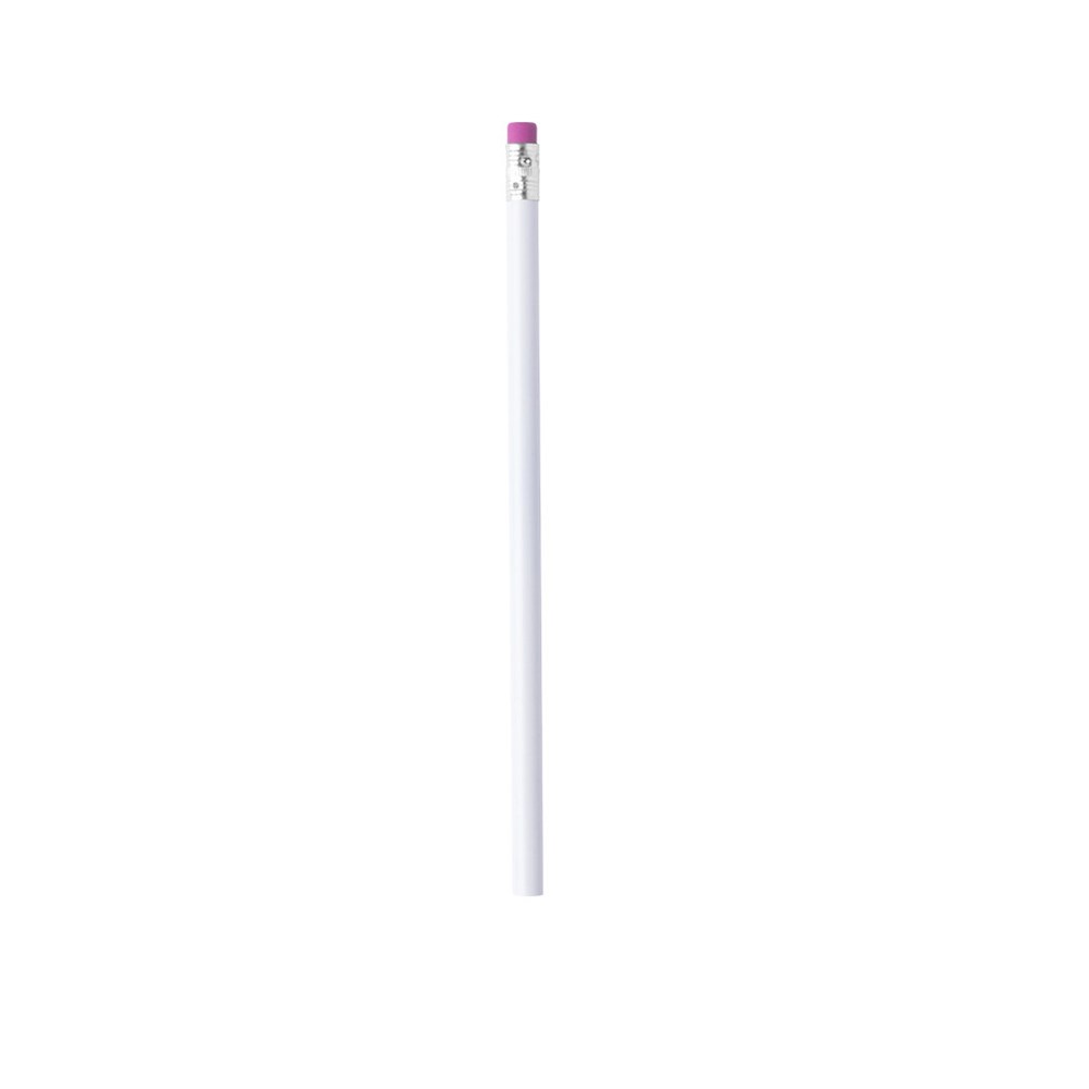 Holzstift in Weiß mit glänzender Oberfläche. Mit rundem Griff und Radiergummi, erhältlich in verschiedenen Farben. Schwarze Mine und ungespitzte Spitze.