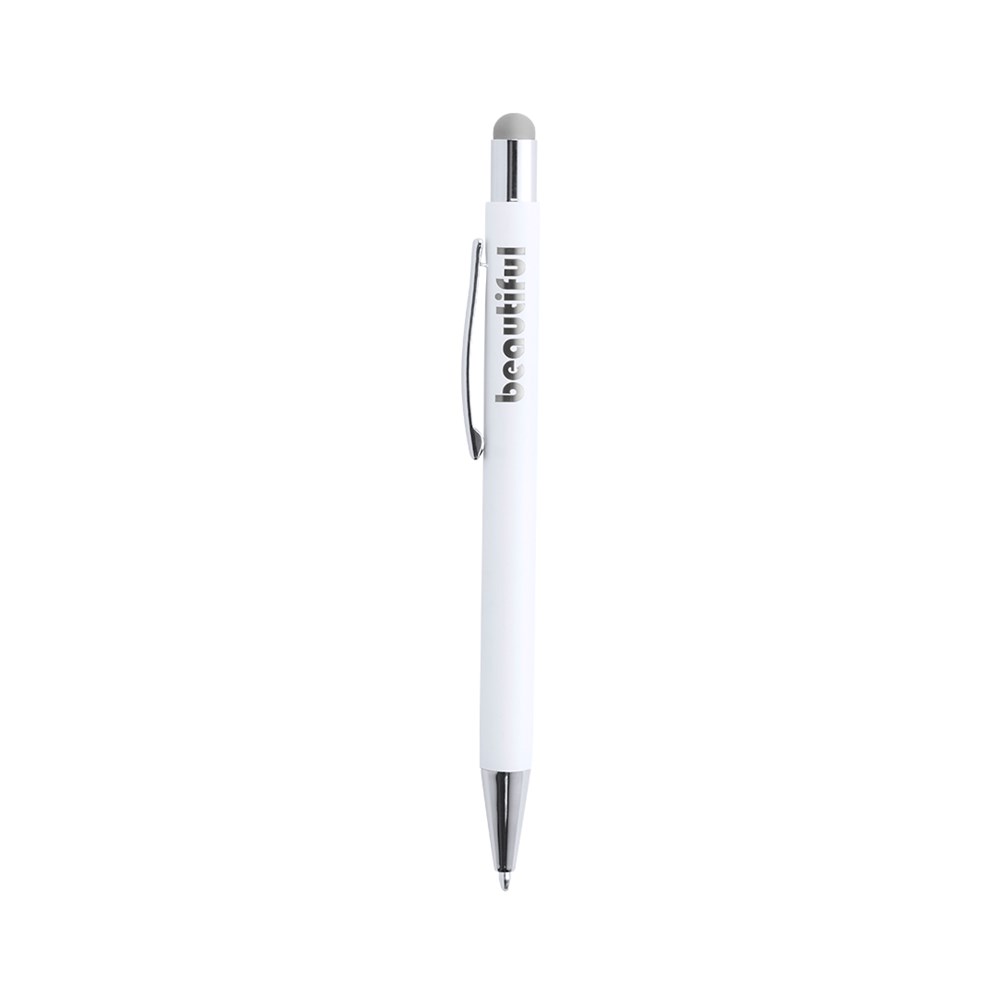 Druck-Kugelschreiber mit Stylus aus Aluminium in einem eleganten, matten Weiß. Mit Stylus in einer Vielzahl von Farben - farblich passend zum Interieur - und verchromten Kontrastdetails. Mit Außenbeschichtung, die speziell für die Lasermarkierung entwickelt wurde, so dass Ihr Logo in der Farbe des Interieurs graviert wird. Jumbo-Patrone mit blauer Tinte.