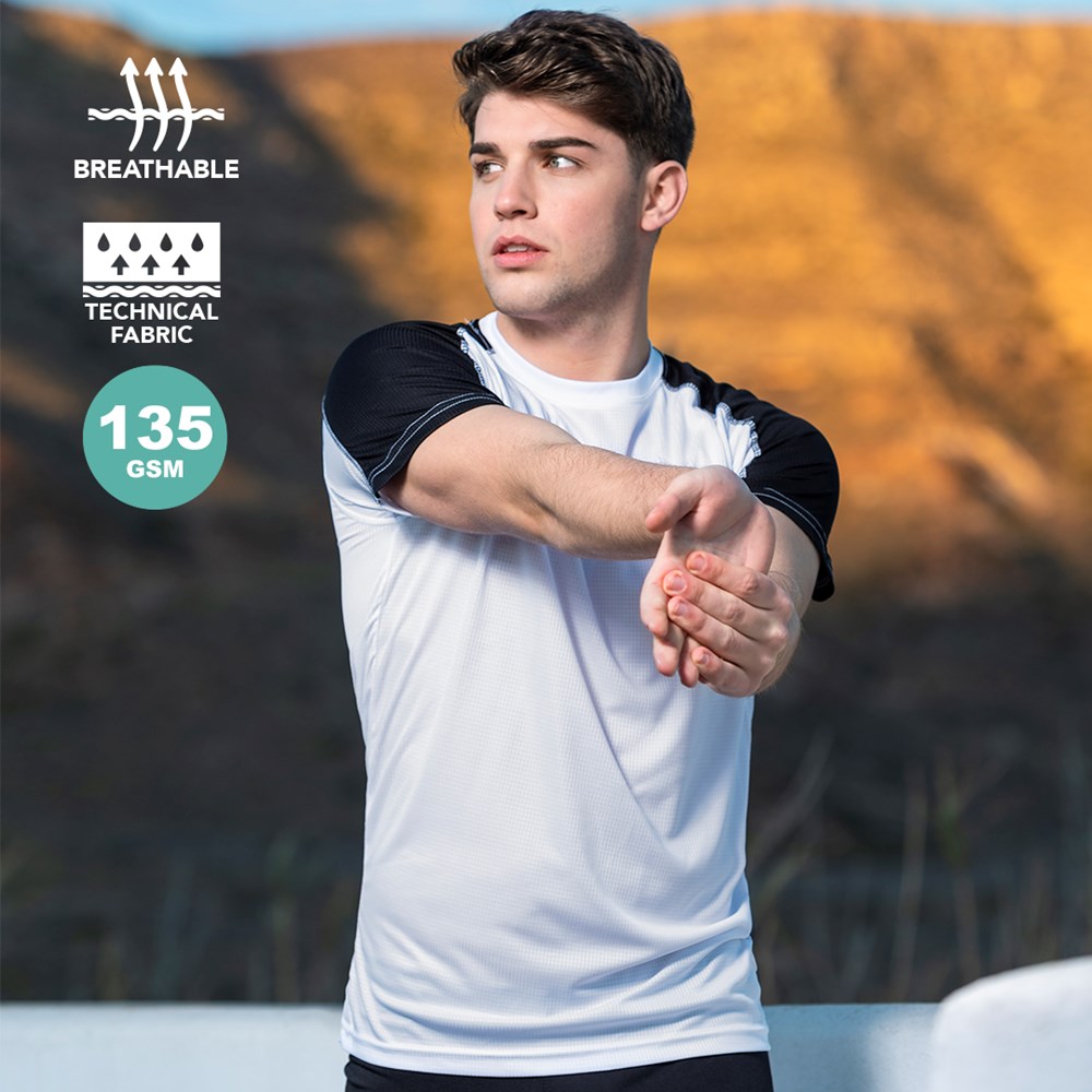 Funktions-T-Shirt für Erwachsene aus dynamischem, atmungsaktivem 100 % Polyester (135 g/m2). Mit originellem Design in Weiß mit farbigen Streifen auf den Ärmeln. Erhältlich in einer Vielzahl von Farben und den Größen S, M, L, XL und XXL.