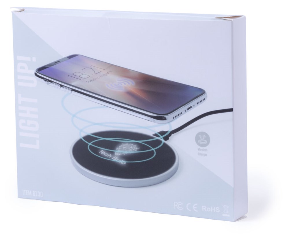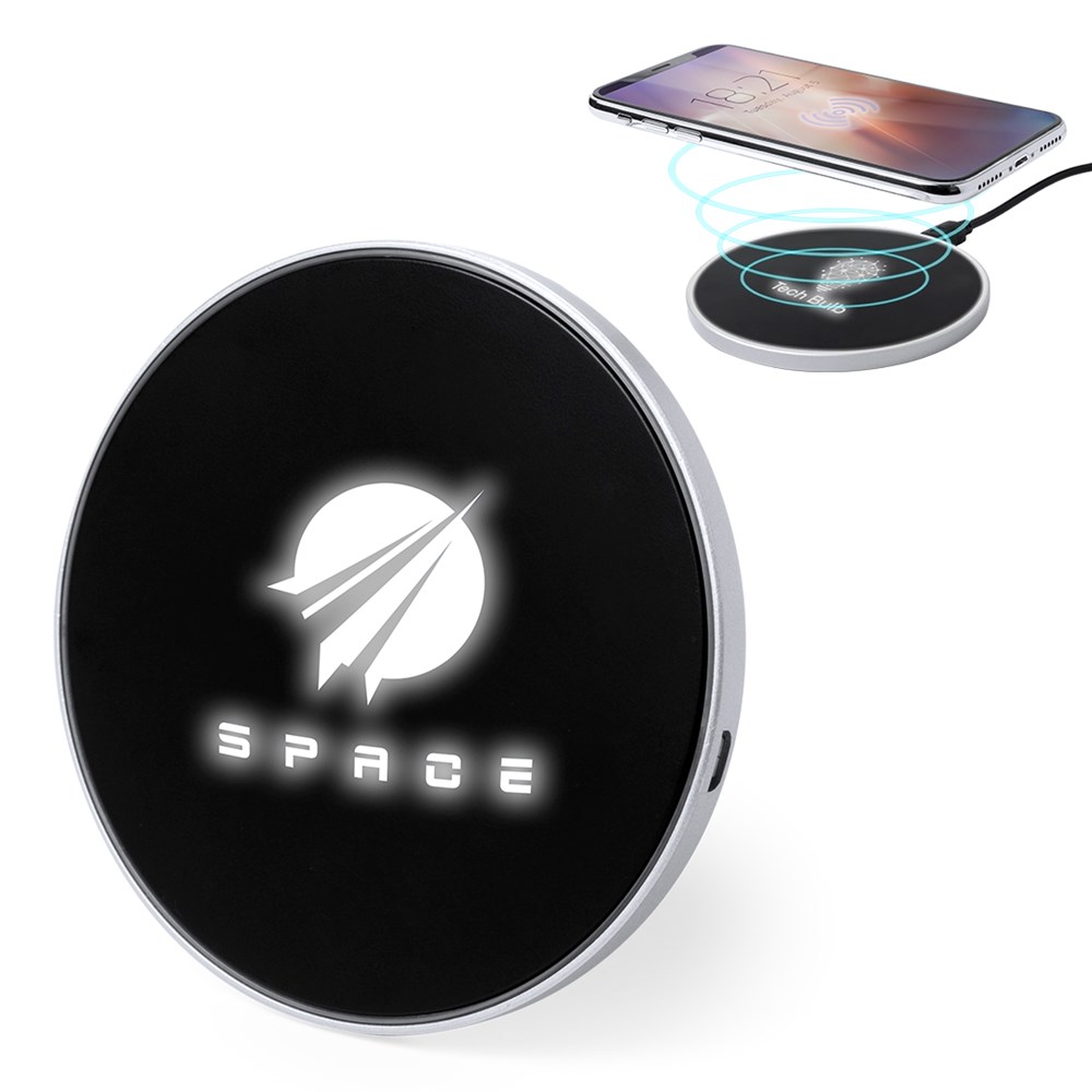 Rundes Design, kabelloses Ladegerät. Innenliegendes LED-Licht und Gehäuse speziell für den Laserdruck zur Beleuchtung des Logos. Mit rutschfester Unterseite, kompatibel mit Geräten mit kabelloser Ladetechnologie und präsentiert in einer attraktiven Designbox. USB-Kabel im Lieferumfang enthalten.