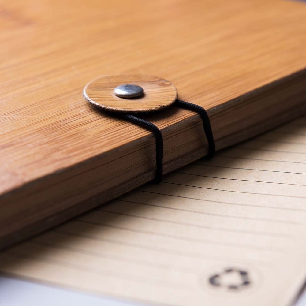 Ring-Notizbuch der Linie Nature mit robustem Bambus-Cover und originellem Gummibandverschluss. Mit 80 linierten Blättern mit ökologischem Design.