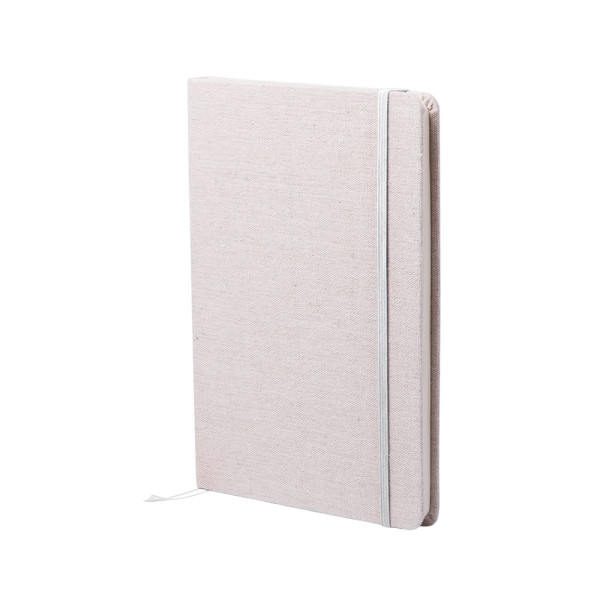 Notizbuch aus natürlichen Materialien. Cover aus weicher, natürlicher Baumwolle in Naturfarbe. Mit Gummibandverschluss und Lesezeichenband in passenden, auffälligen Farben. Enthält 80 Blätter.