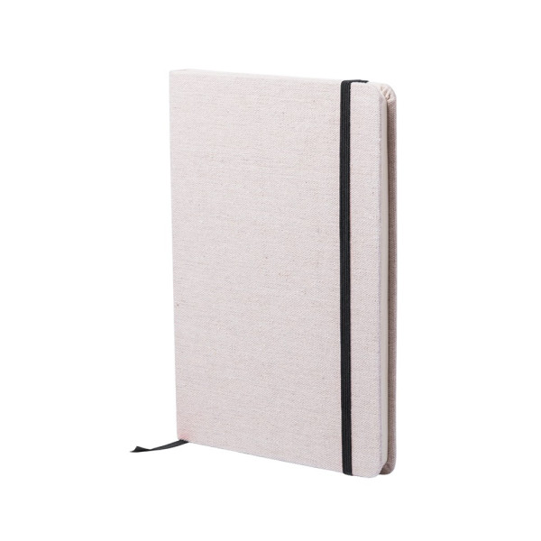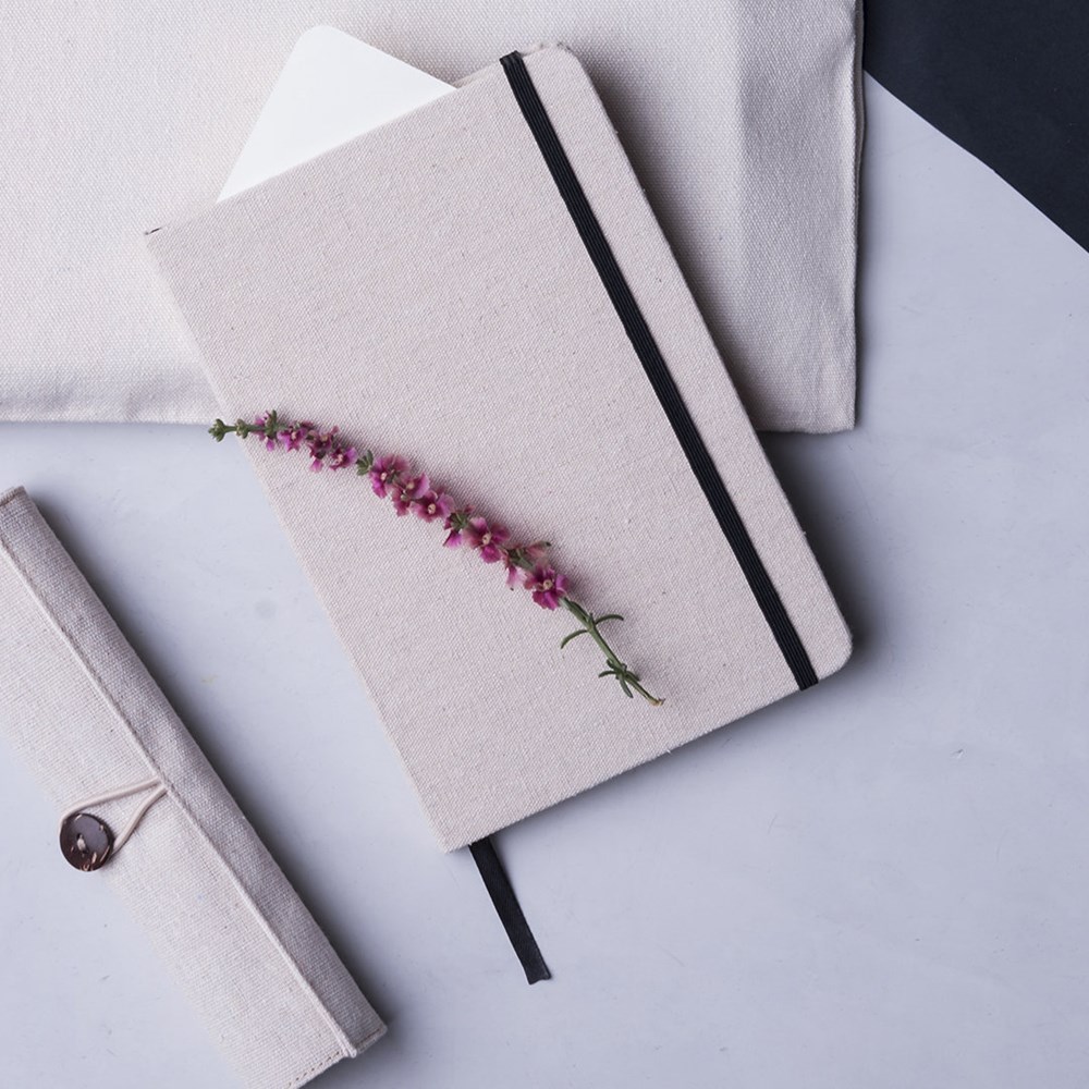 Notizbuch aus natürlichen Materialien. Cover aus weicher, natürlicher Baumwolle in Naturfarbe. Mit Gummibandverschluss und Lesezeichenband in passenden, auffälligen Farben. Enthält 80 Blätter.