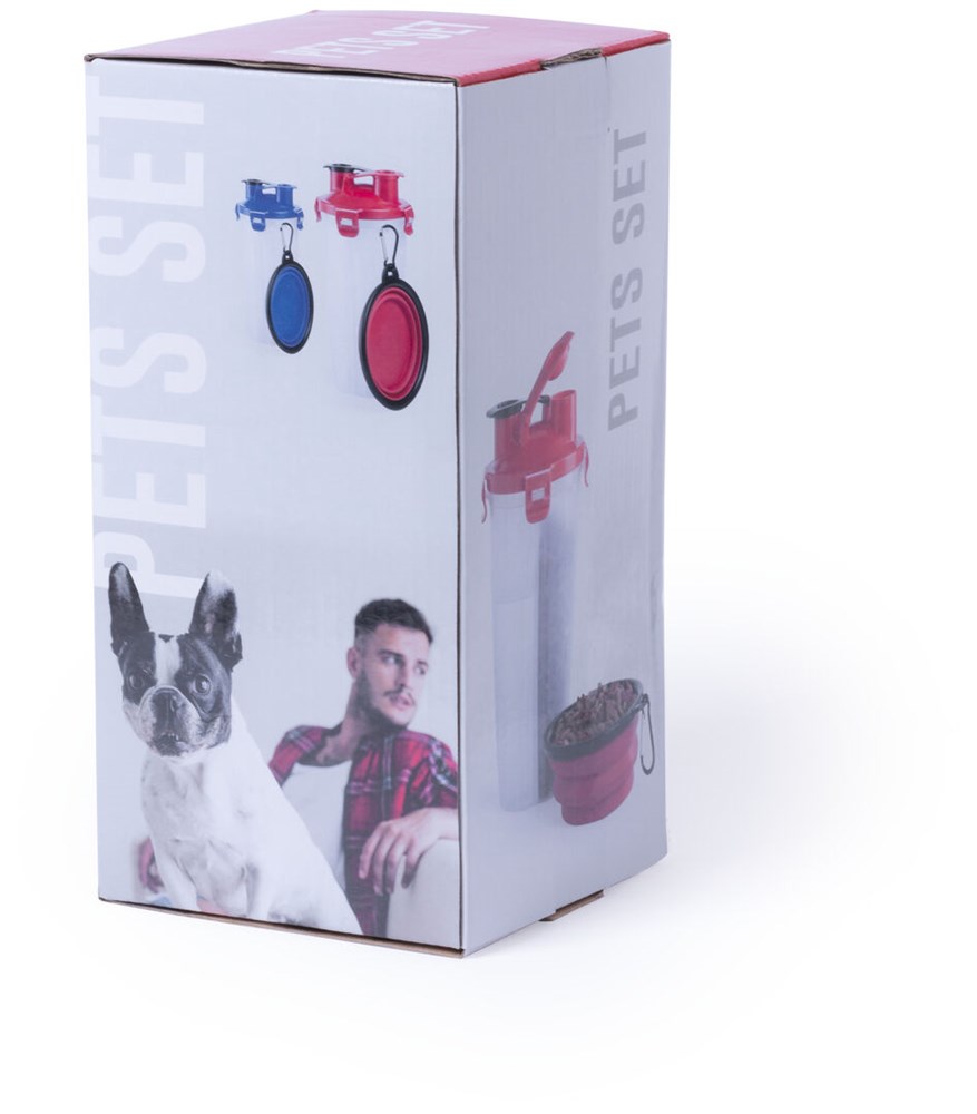 Haustier-Set. Enthält eine praktische Flasche mit 2 Fächern - Futter und Wasser - und Sicherheitsverschluss. Faltbarer Napf in passender Farbe mit Metallkarabiner.