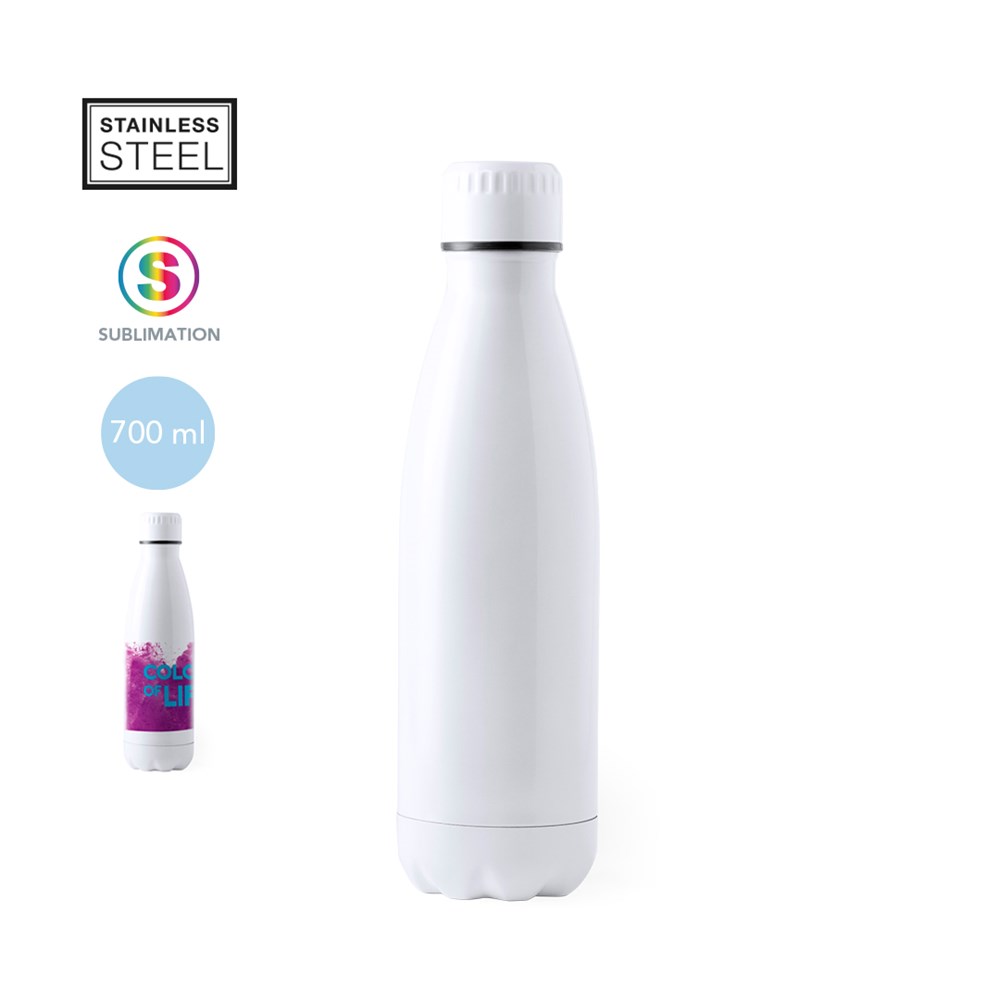 Trinkflasche mit 700 ml Fassungsvermögen. Körper aus Edelstahl in Glänzend Weiß. Mit Sicherheitsverschluss. Präsentiert in einer individuellen, attraktiven Designbox.