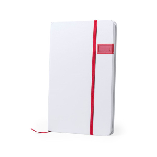 Notizblock mit coolem Design in Weiß. Mit im Cover integriertem USB-Speicher von 16 GB, Gummibandverschluss und Lesezeichenband in passender Farbe. Mit 100 linierten Blättern. Erhältlich in verschiedenen lebendigen Farben.