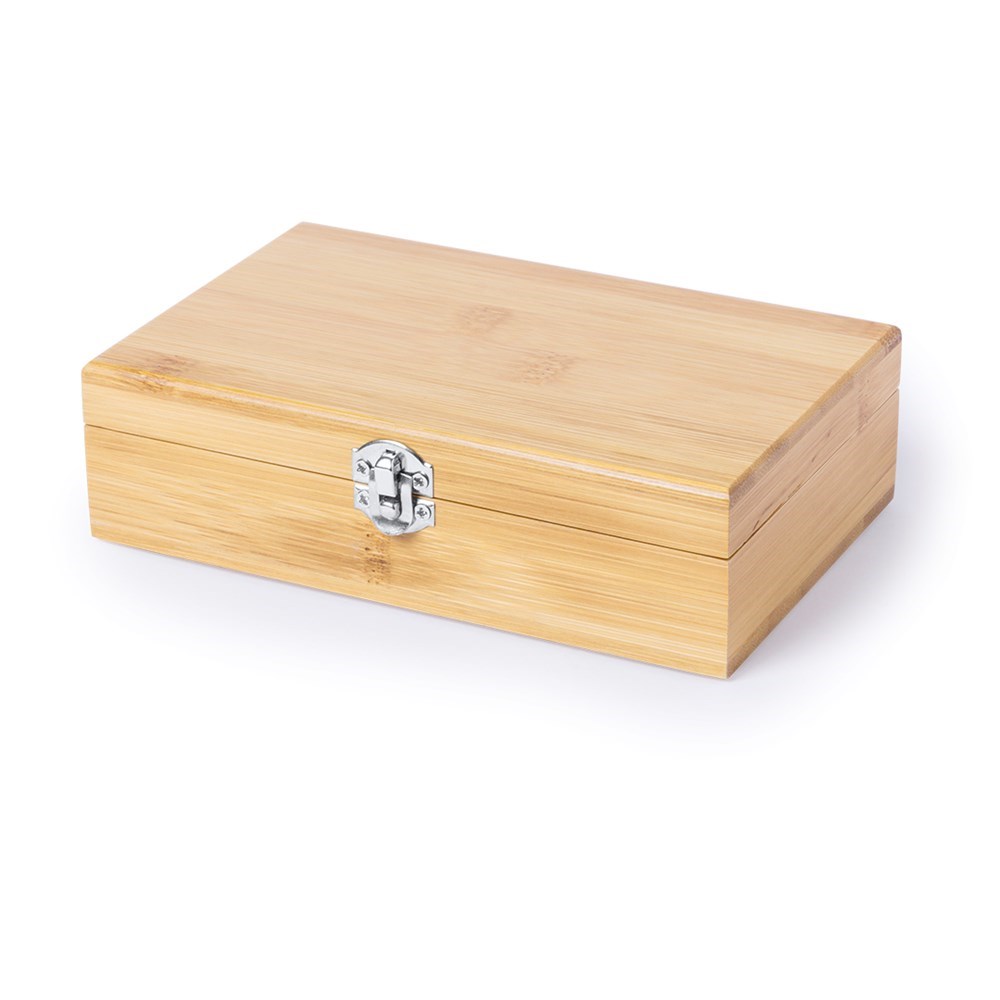 Wein-Set aus Bambusholz. Mit Accessoires aus Edelstahl: Korkenzieher, Dosierkappe und Tropfring. Präsentiert in einer individuellen Bambus-Box mit Stanzung im Inneren.