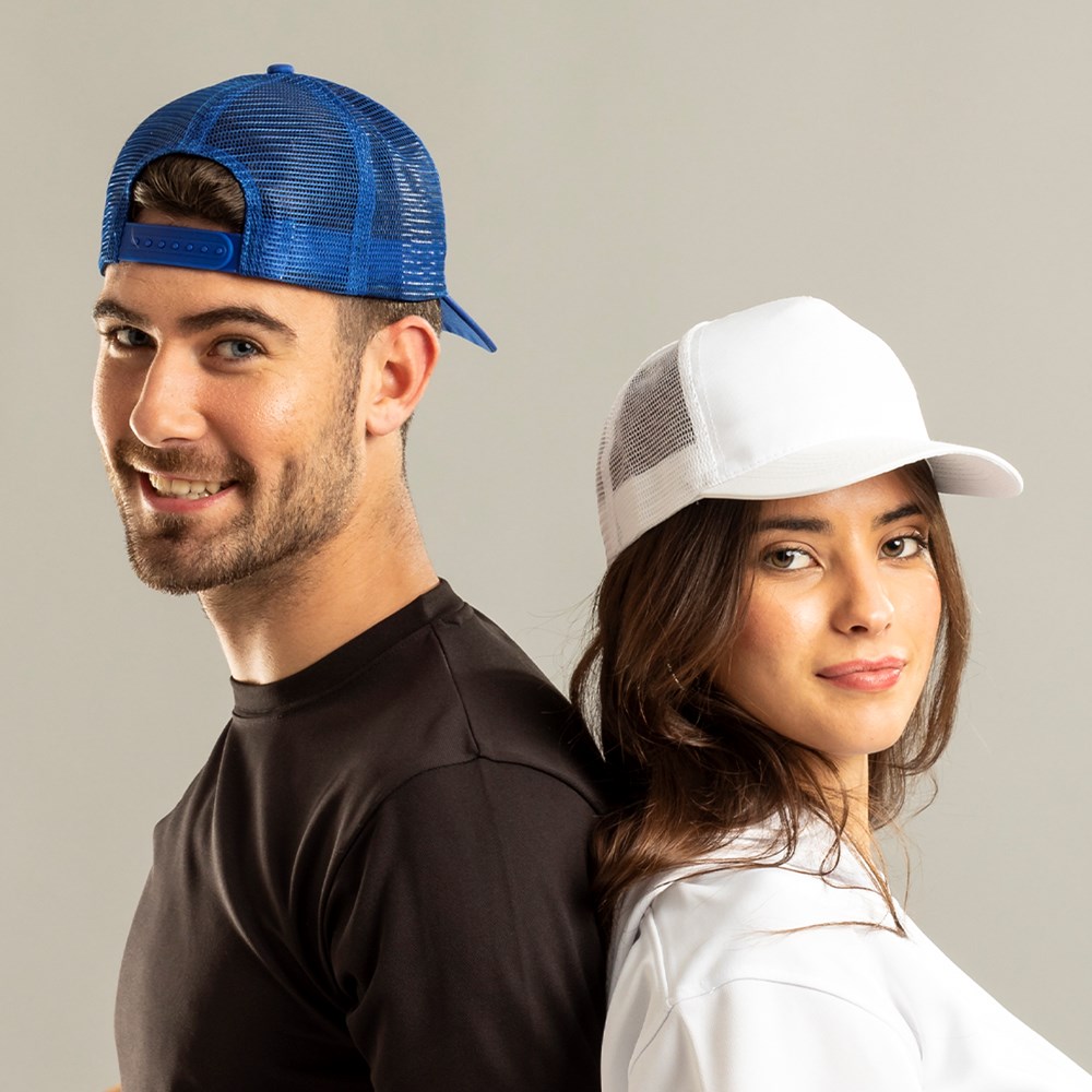 5-Panel-Kappe aus Polyester, mit Netzgewebe und verstellbarem Kunststoffverschluss. Erhältlich in einer breiten Palette von lebendigen Farben (weiße Farbe, die speziell für den Sublimationsdruck hergestellt wurde).