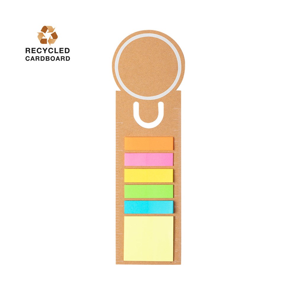 Lesezeichen-Lineal in der Naturlinie. Hergestellt aus recycelter Pappe, mit einer breiten Druckfläche. Inklusive 15 Haftnotizen mittlerer Größe und 75 Mini-Haftnotizen