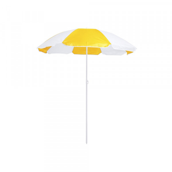 Strandschirm aus 8 Bahnen aus widerstandsfähigem Nylon und in 2 Farbkombinationen. 150 cm Durchmesser, mit Seitenschürzen mit Keder und metallbeschichteten Rohren in weißer Farbe. In der Höhe verstellbar und in einer PVC-Hülle mit Schulterriemen präsentiert. Erhältlich in einer breiten Palette von kombinierten Farben.