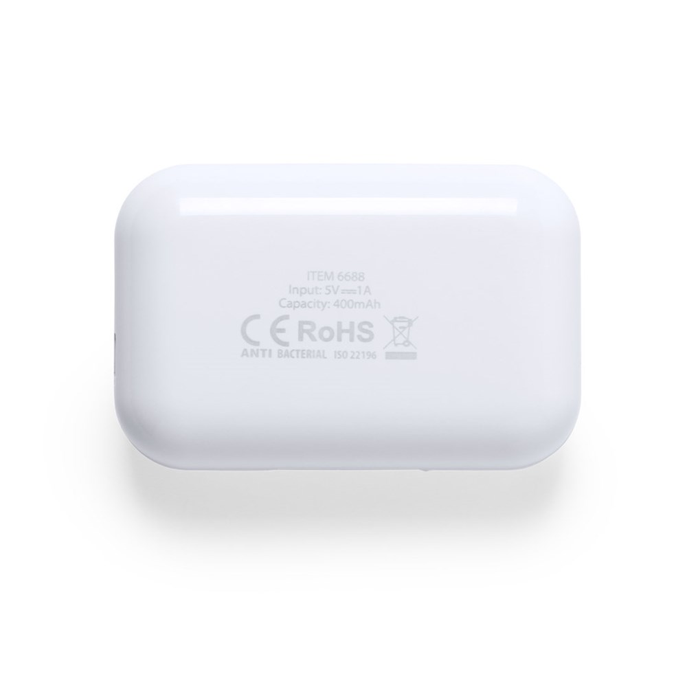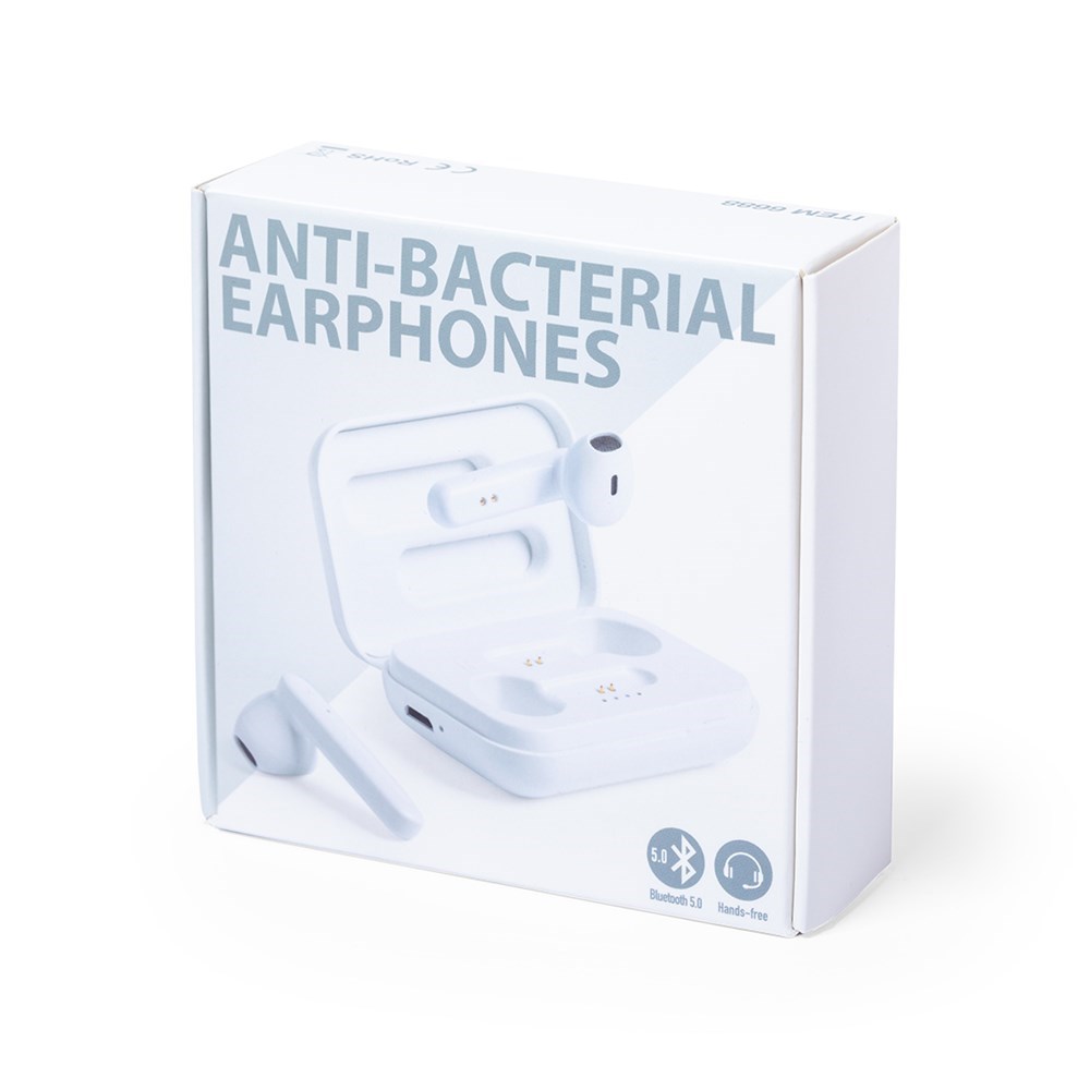Antibakterieller Kopfhörer mit Bluetooth 5.0-Buchse in einem eleganten weißen Farbdesign in glänzender Ausführung. Ergonomisches Design, einschließlich eines integrierten Touch-Control-Knopfes im Ohrhörer, mit farblich angepasster Ladestation. Freisprechfunktion und wiederaufladbares Mikro-USB-Kabel im Lieferumfang enthalten. Präsentiert in einem individuellen Luxus-Etui mit Scharnierdeckel und in einer attraktiven Design-Box. Produkte mit antibakterieller Behandlung sind in der Lage, den Bakteriengehalt auf den Materialoberflächen dank der Zugabe permanenter statischer mikrobieller Wirkstoffe drastisch zu reduzieren, mit hoher Wirksamkeit bei der Hemmung und Verhinderung bakterieller Verunreinigungen. Artikel nach der Norm ISO 22196, die die antibakterielle Aktivität in Kunststoffen und auf nicht porösen Oberflächen bestimmt. Dies erlaubt es uns, die Wirksamkeit der Bakterienhemmung, die die Zusatzstoffe auf den behandelten Artikeln haben, anhand einer quantitativen Bewertung zu bestimmen.