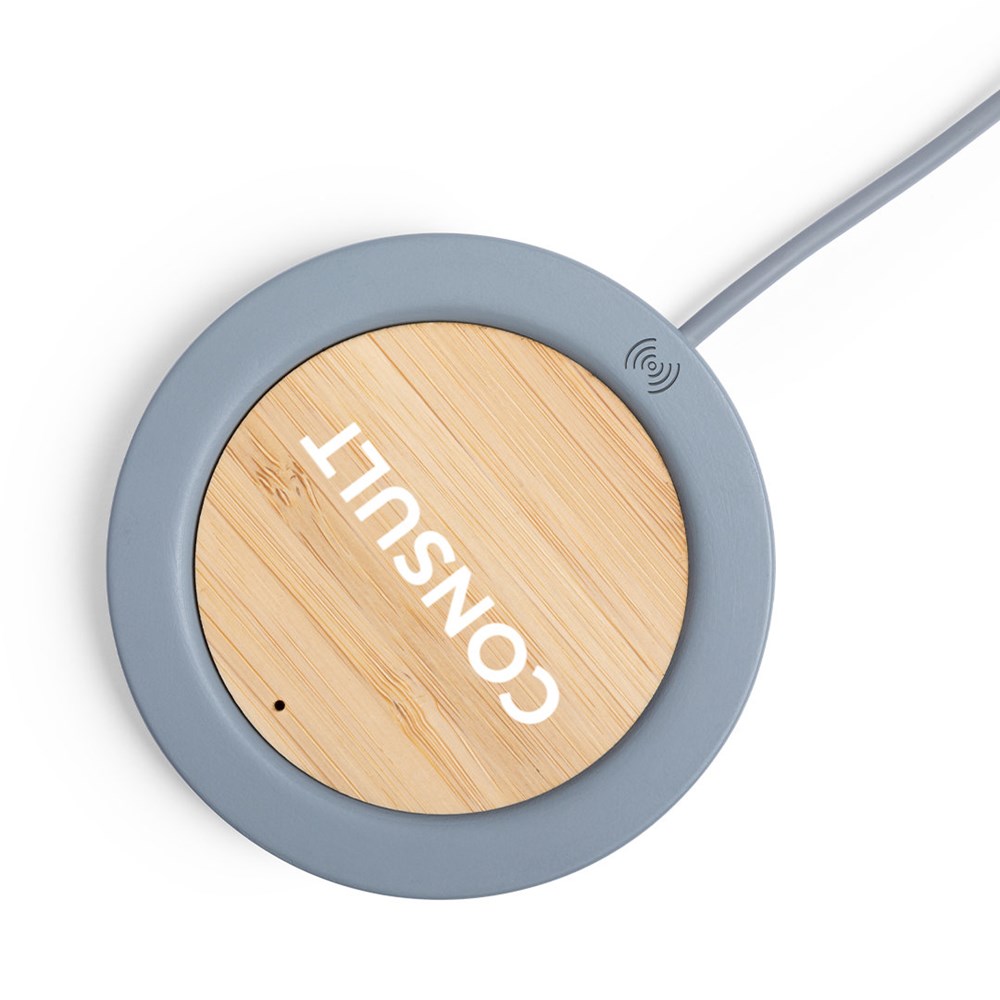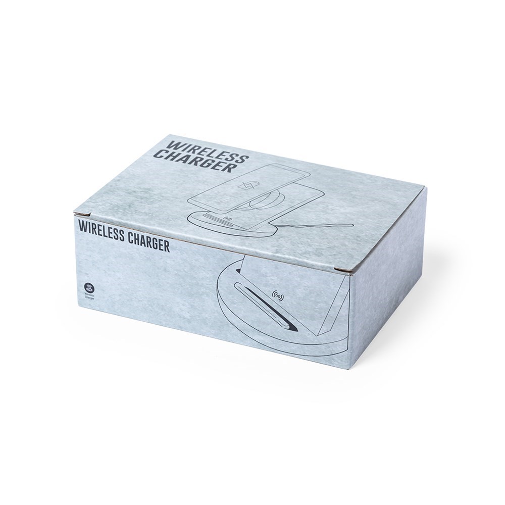 Drahtloses Ladegerät mit rundem Design in Kombination aus natürlich geschnittenen Bambusstücken und Kalksteinzement, einem Konglomerat, das durch die Mischung natürlicher Materialien, hauptsächlich gemahlener Kalkstein und Wasser, gebildet wird, wodurch ein Material von großer Konsistenz und Haltbarkeit entsteht.USB-Ladekabel in passender Farbe, kompatibel mit Geräten, die mit drahtloser Ladetechnologie ausgestattet sind. Sicherheitsschutz zur Vermeidung von Überhitzung, Überladung und Kurzschluss. Präsentiert in einer attraktiven Design-Box.