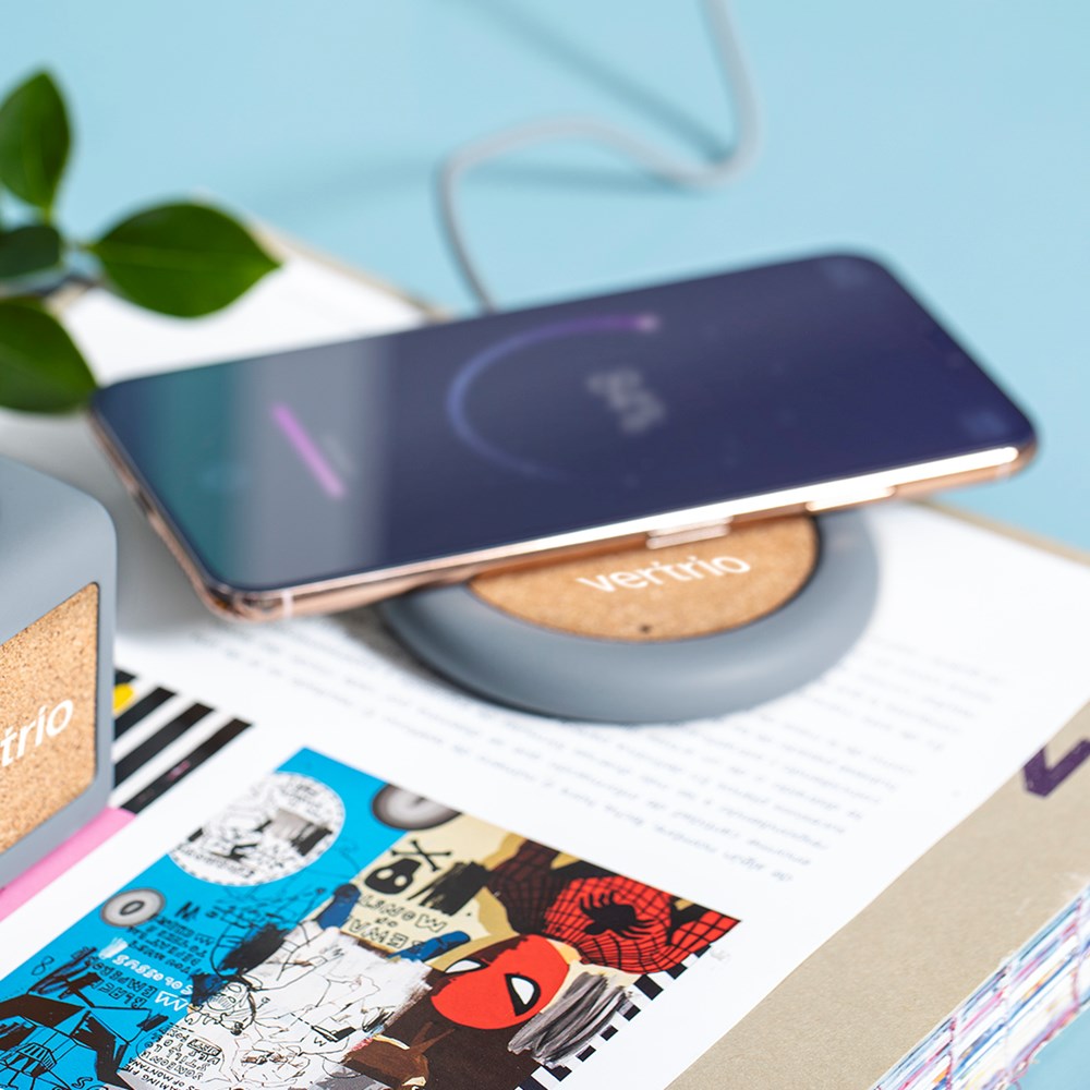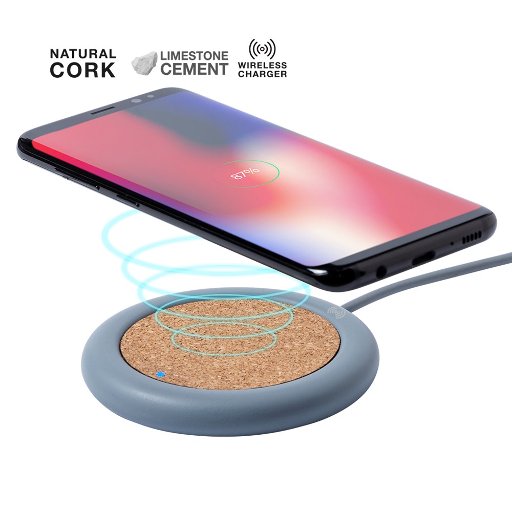 Drahtloses Ladegerät 5W Nature Line im kreisförmigen Design, in Kombination von Naturkork und Kalksteinzement, einem Konglomerat, das durch Mischen von natürlichen Materialien, hauptsächlich gemahlenem Kalkstein und Wasser, gebildet wird, wodurch ein Material von großer Konsistenz und Haltbarkeit entsteht.LED-Anzeige und passendes 1 m langes USB-Ladekabel. Kompatibel mit Geräten, die mit kabelloser Ladetechnik ausgestattet sind. Sicherheitsschutz zum Schutz vor Überhitzung, Überladung und Kurzschluss. Präsentiert in attraktiver Öko-Design-Box.