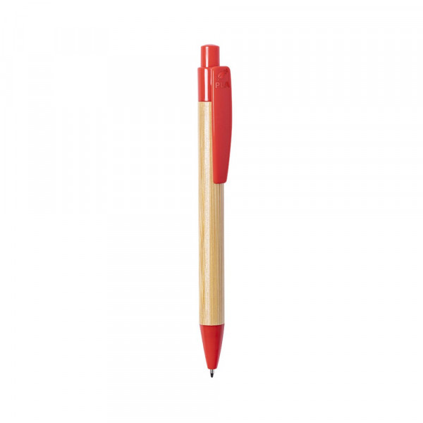 Nature Line Kugelschreiber mit Druckknopfmechanik. Kombination aus glänzendem Bambuskörper und Zubehör aus PLA -Poly Milchsäure-, die aus 100% natürlichen Ressourcen wie Maisstärke, Maniok oder Zuckerrohr gewonnen wird und am Ende ihres Lebenszyklus zu 100% kompostierbar ist. Clip mit großer Beschriftungsfläche und in vielen Farben erhältlich, mit blauer Tinte. PLA-Plakette am oberen Teil des Clips.