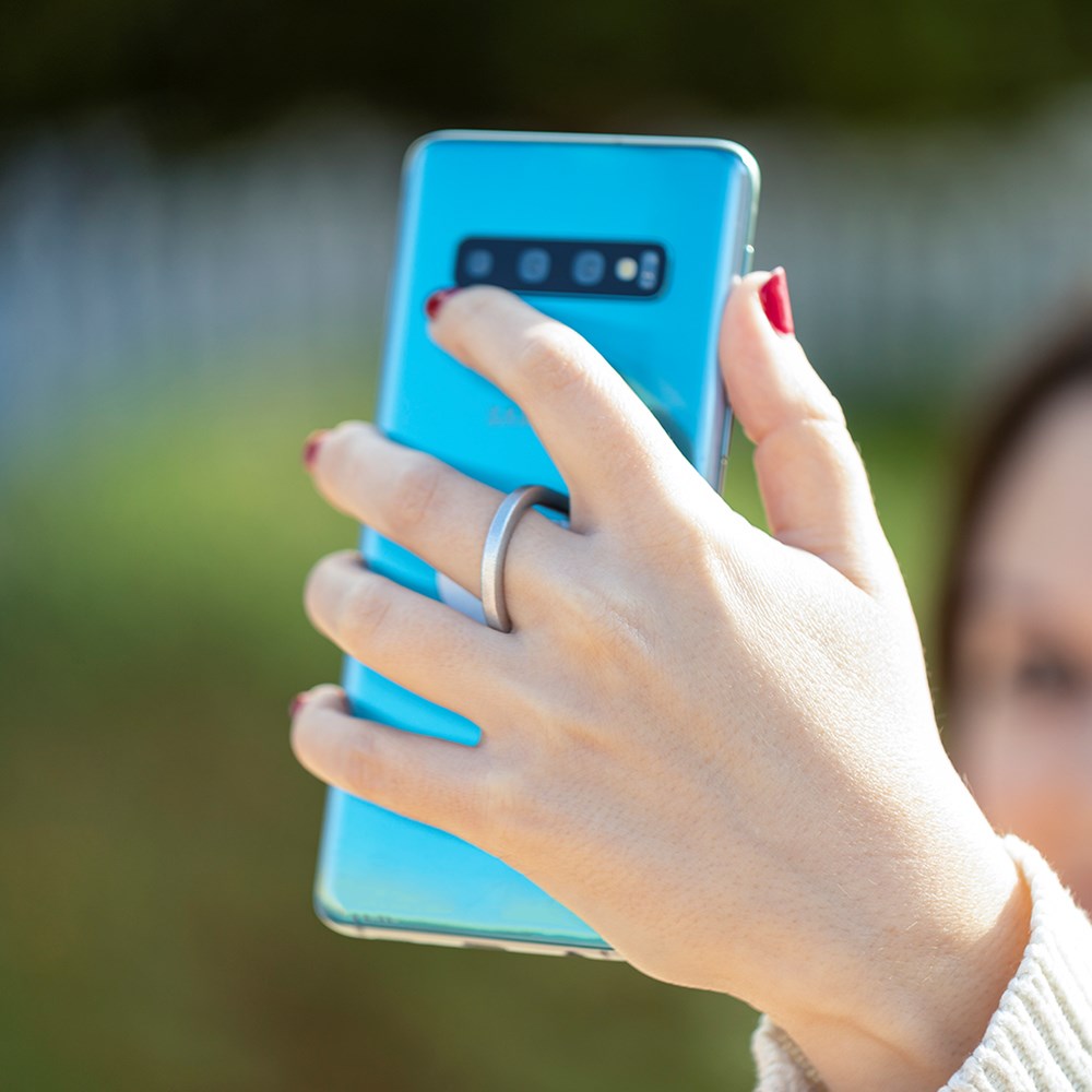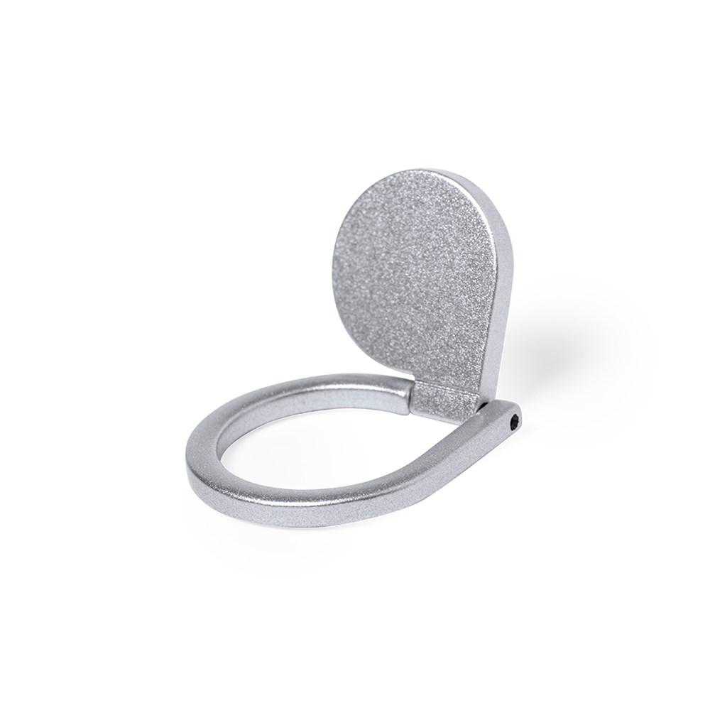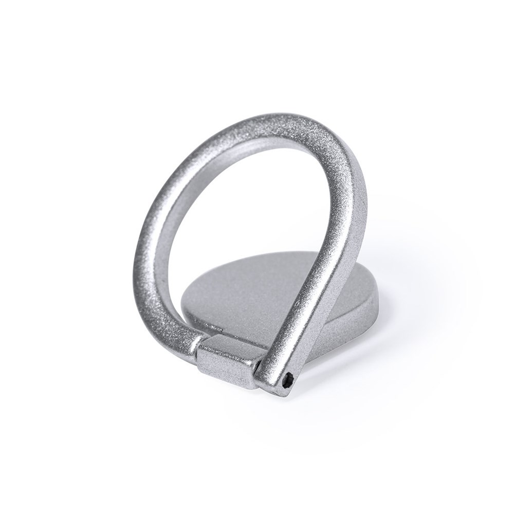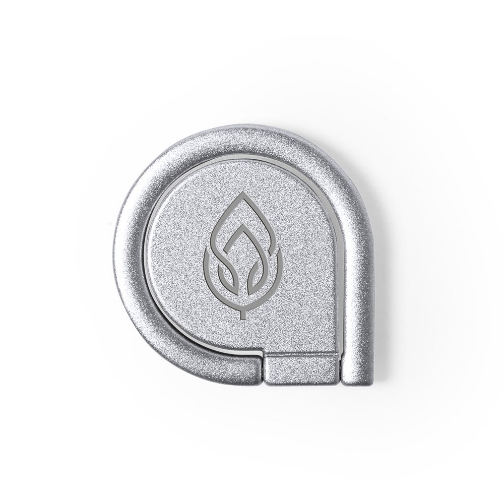 Smartphone-Halterung aus Metall in mattem Finish. Elegantes Design und 3M-Kleber, extra stark und rückstandsfrei beim Ablösen vom Gerät. Mit rückseitiger Fingerringauflage und präsentiert in individueller Designtasche.